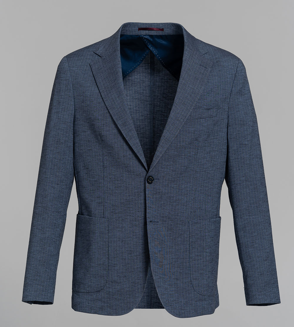Однобортный пиджак прямого кроя изо льна и вискозы. Отложной воротник с прямоугольными лацканами. Длинные рукава, подплечники. Накладные боковые карманы. Изделие частично дополнено подкладочной тканью. Застежка на одну пуговицу.