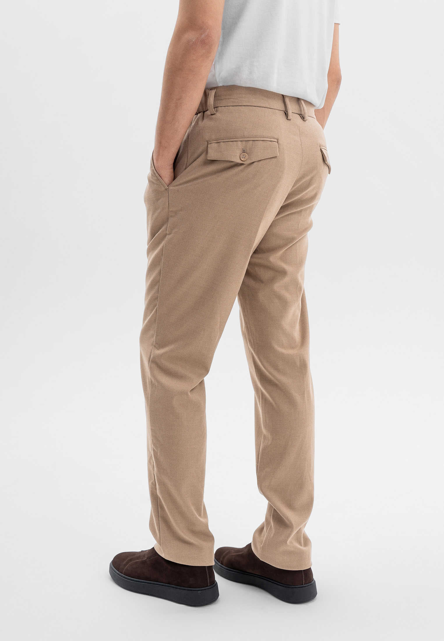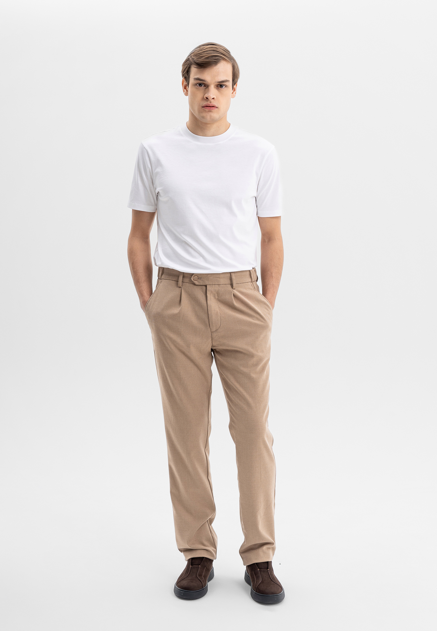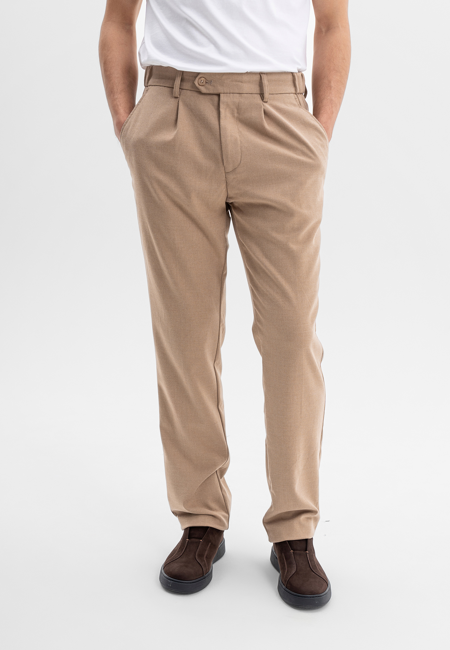 Бежевые брюки CORNELI выполнены из смесовой ткани на основе полиэстера и вискозы с добавлением спандекса. Материал мягкий, износостойкий и эластичный, хорошо держит форму и обеспечивает комфортную посадку. Лаконичный крой подчёркивает силуэт и делает модель универсальной для повседневных и smart-casual образов.