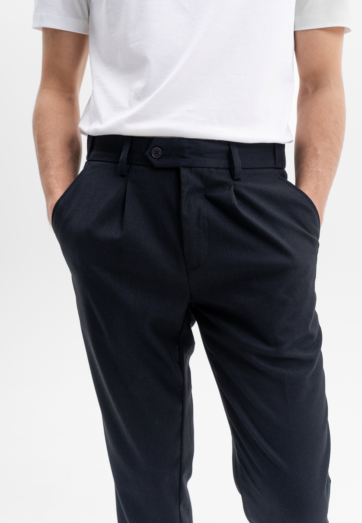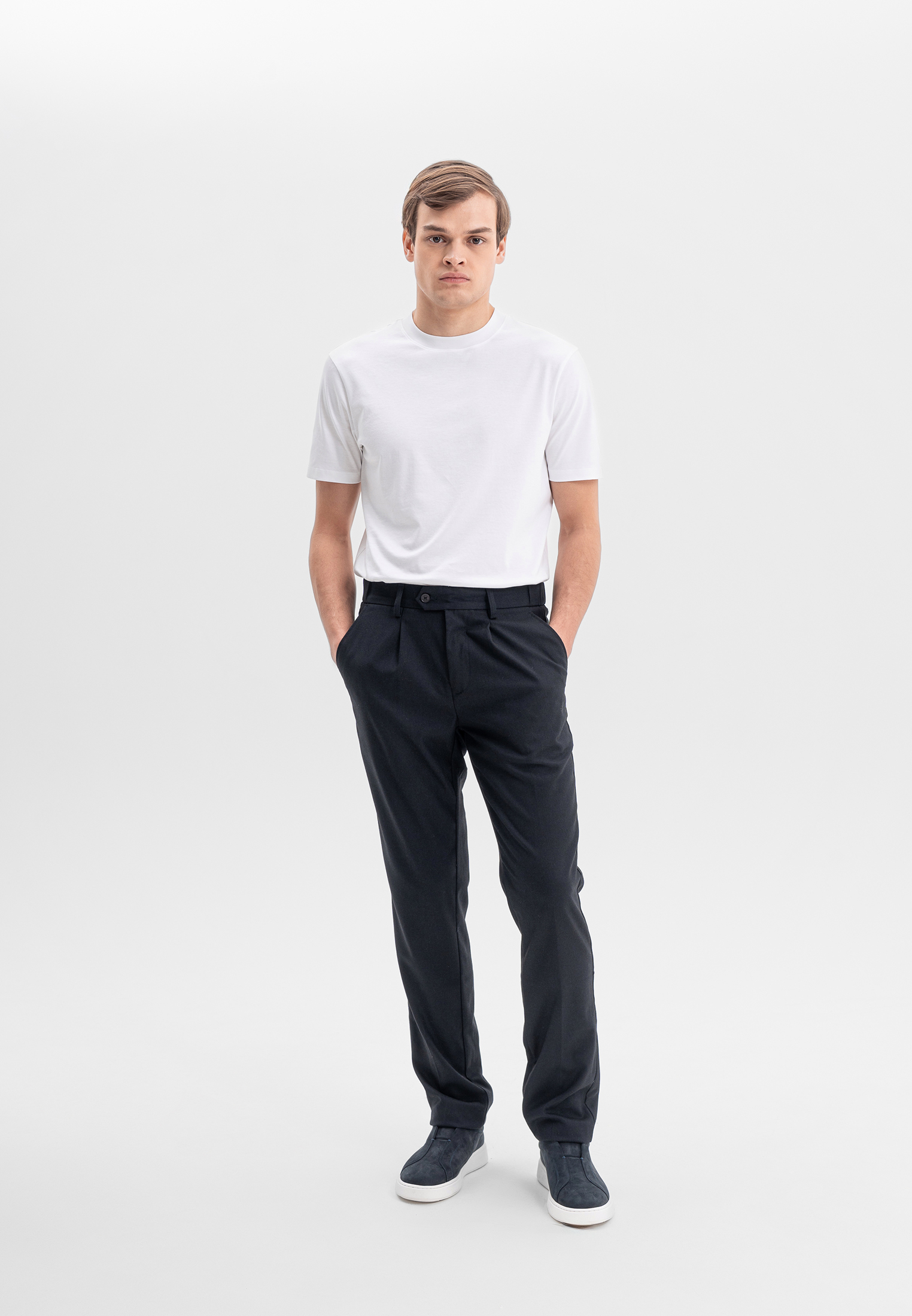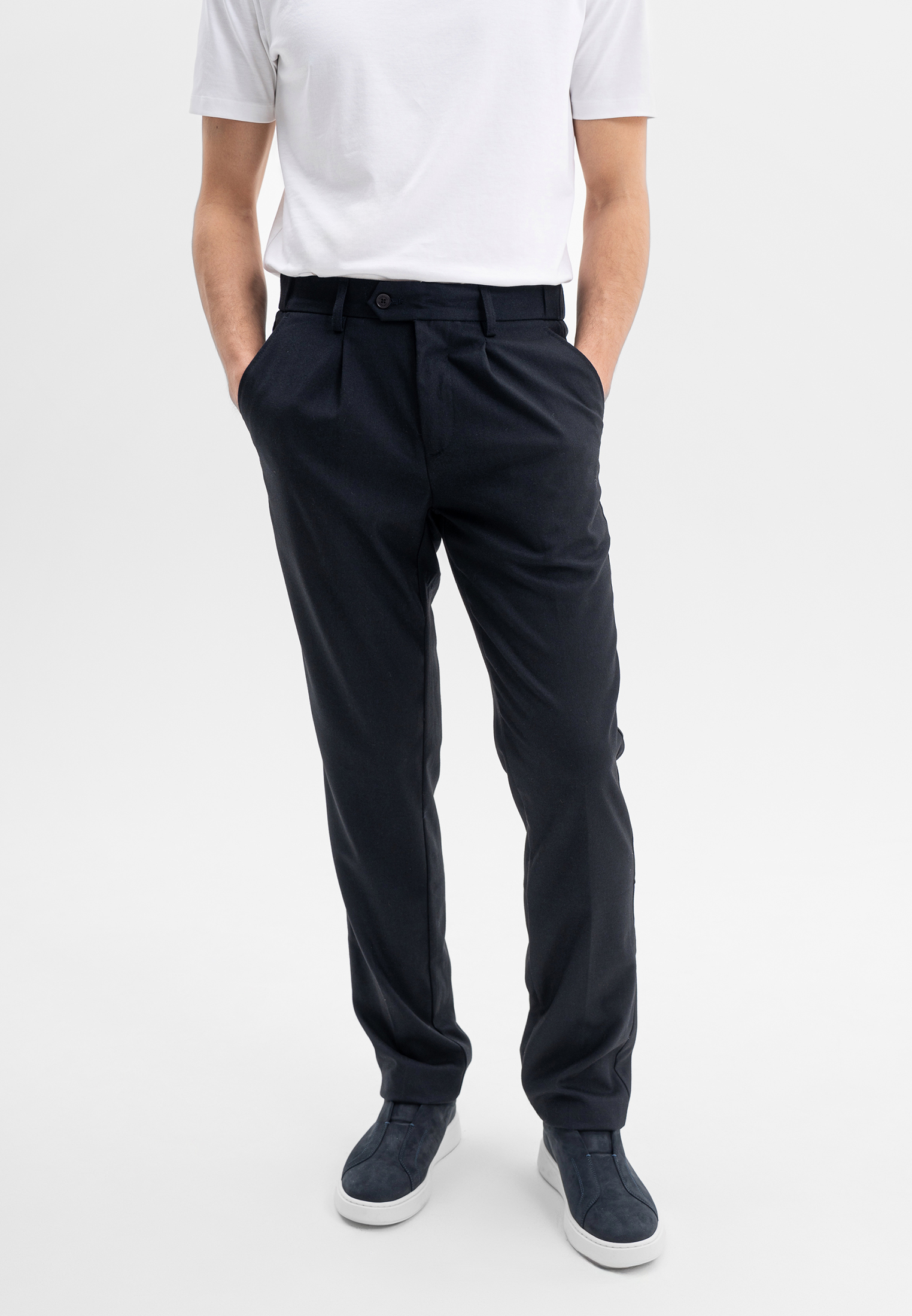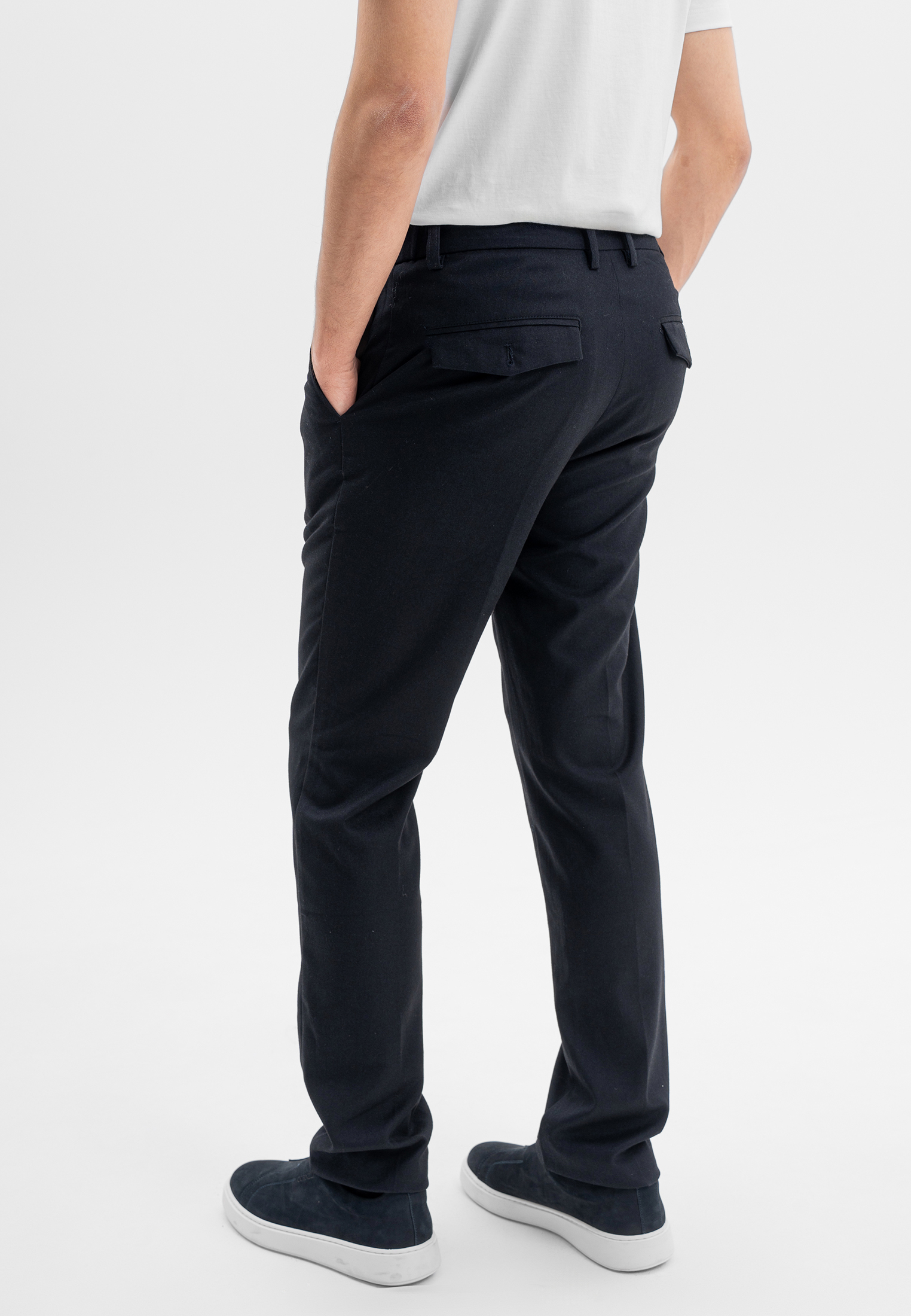 Тёмно-синие брюки CORNELI выполнены из смесовой ткани на основе полиэстера и вискозы с добавлением спандекса. Материал мягкий, износостойкий и эластичный, хорошо держит форму и обеспечивает комфортную посадку. Классический крой подчёркивает силуэт и делает модель универсальной для повседневных и smart-casual образов.