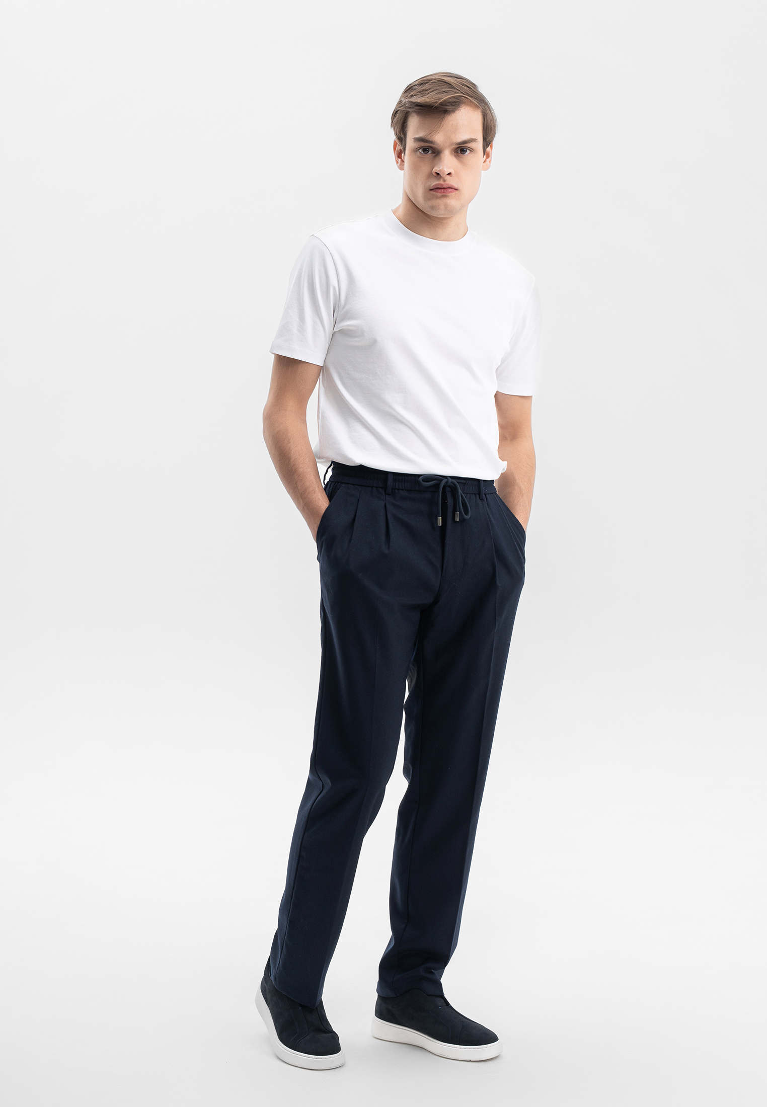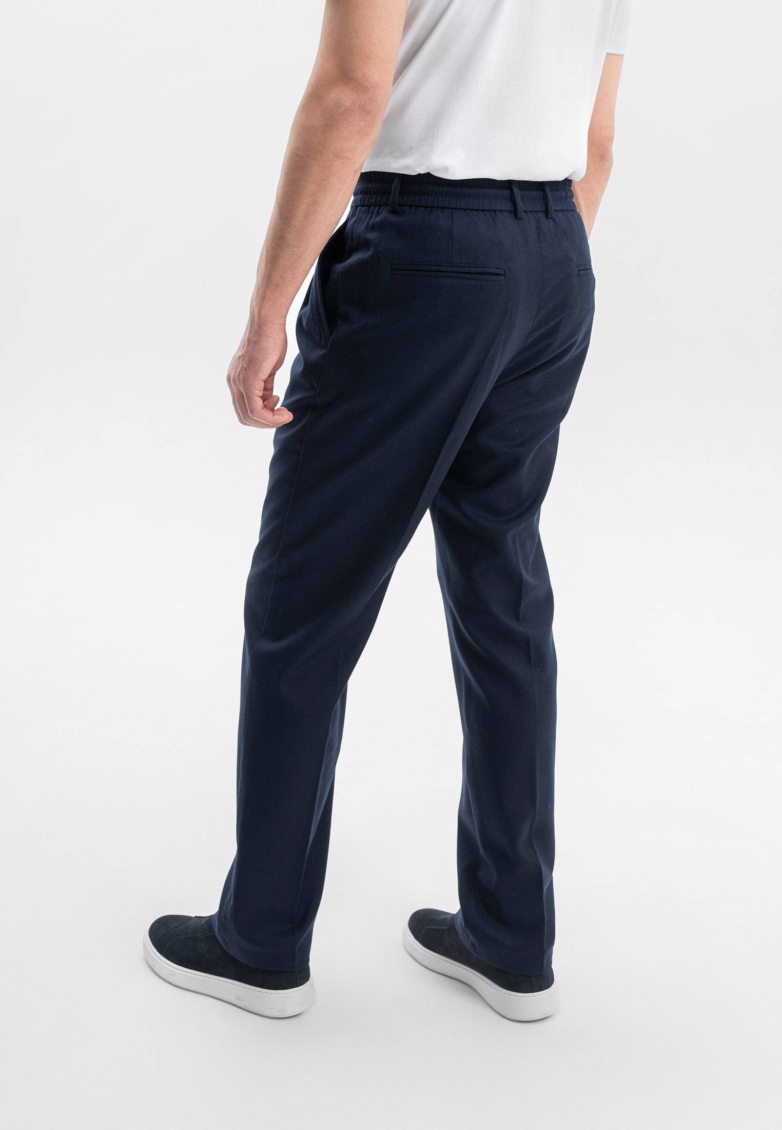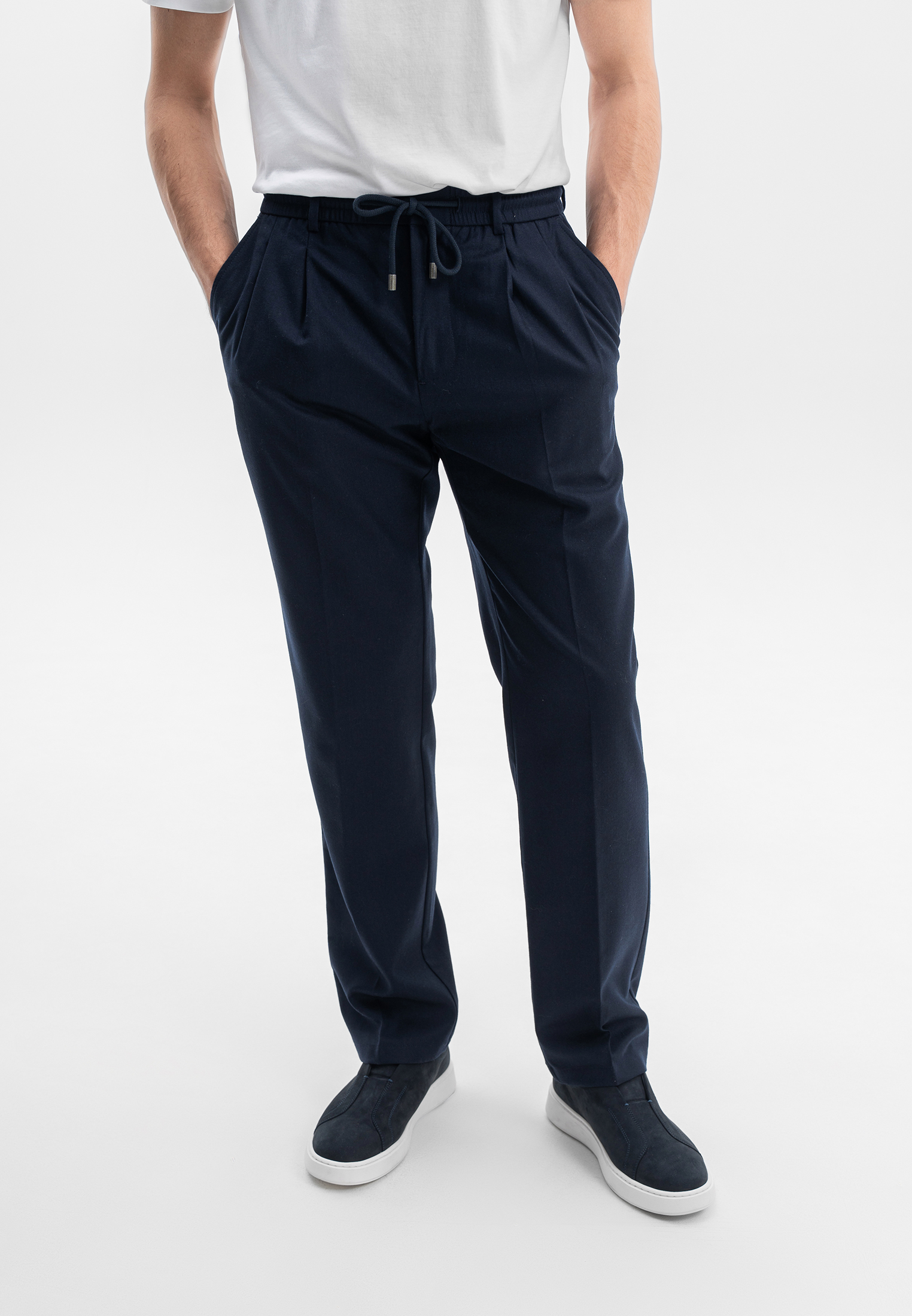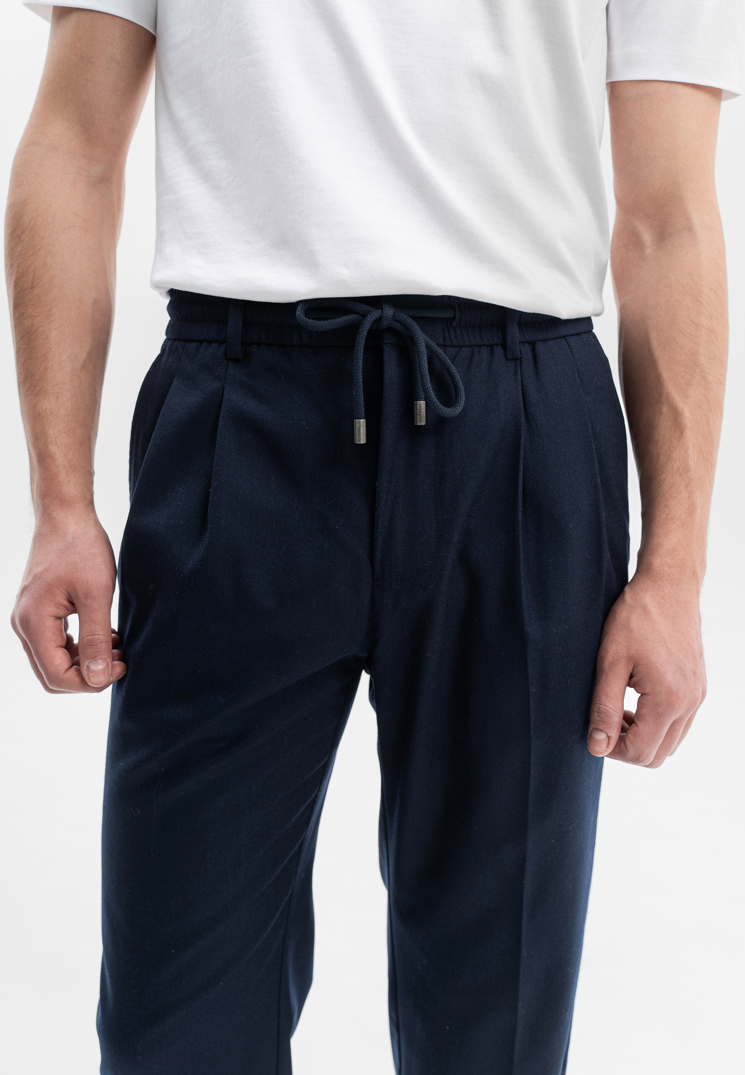 Тёмно-синие брюки CORNELI выполнены из премиальной смесовой ткани на основе шерсти с добавлением кашемира. Материал мягкий, тёплый и приятный к телу, отличается благородной текстурой и высокой износостойкостью. Эластичный пояс со шнурком и аккуратные складки обеспечивают комфортную посадку и современный силуэт. Универсальная модель для повседневных и smart-casual образов.