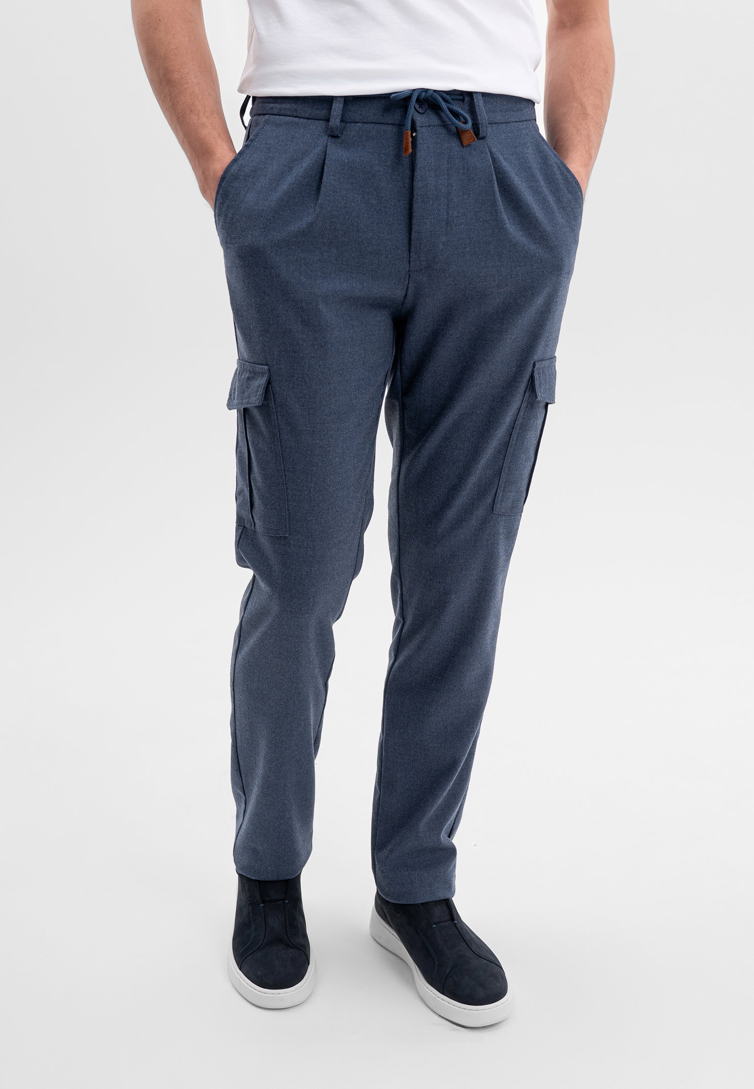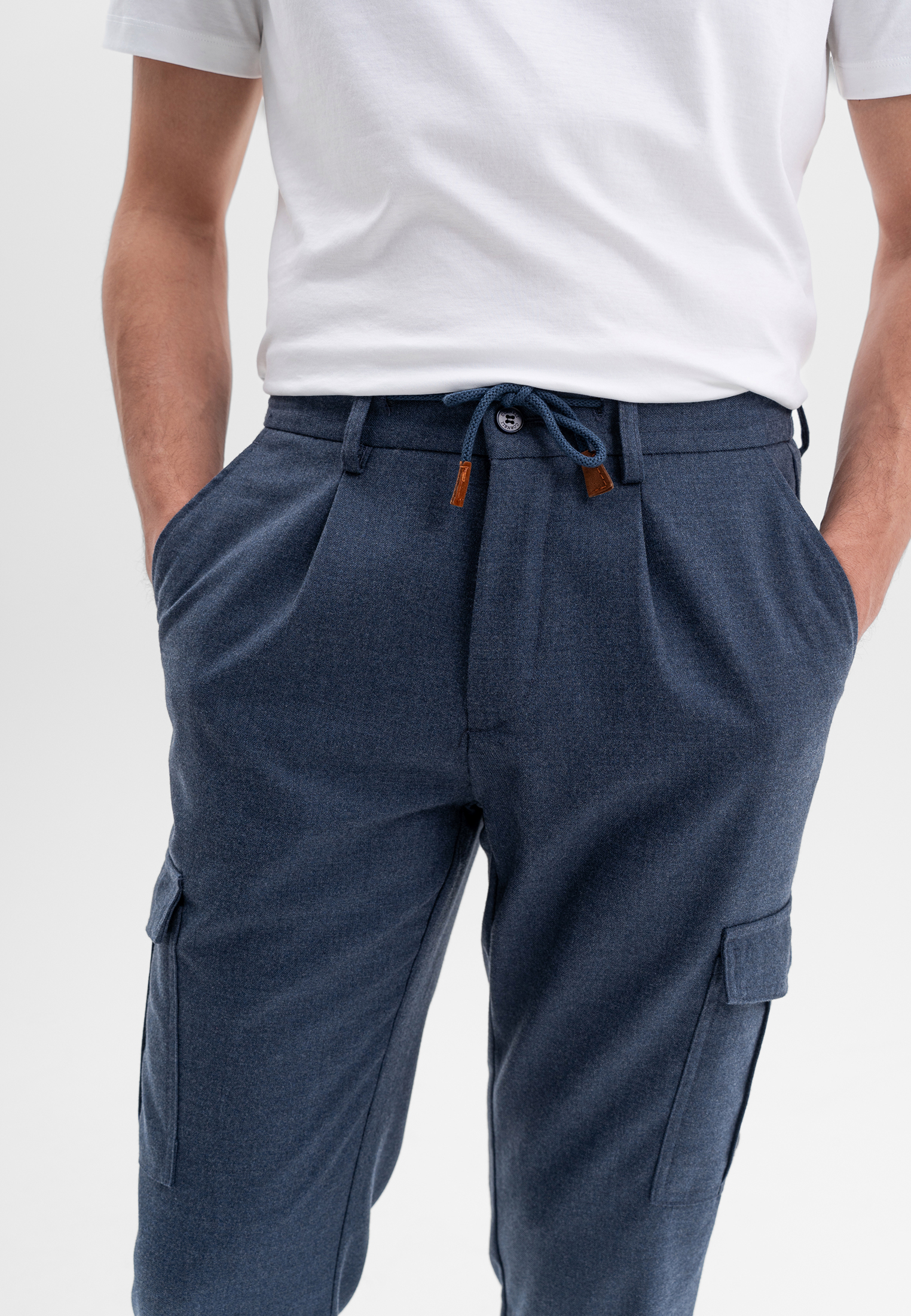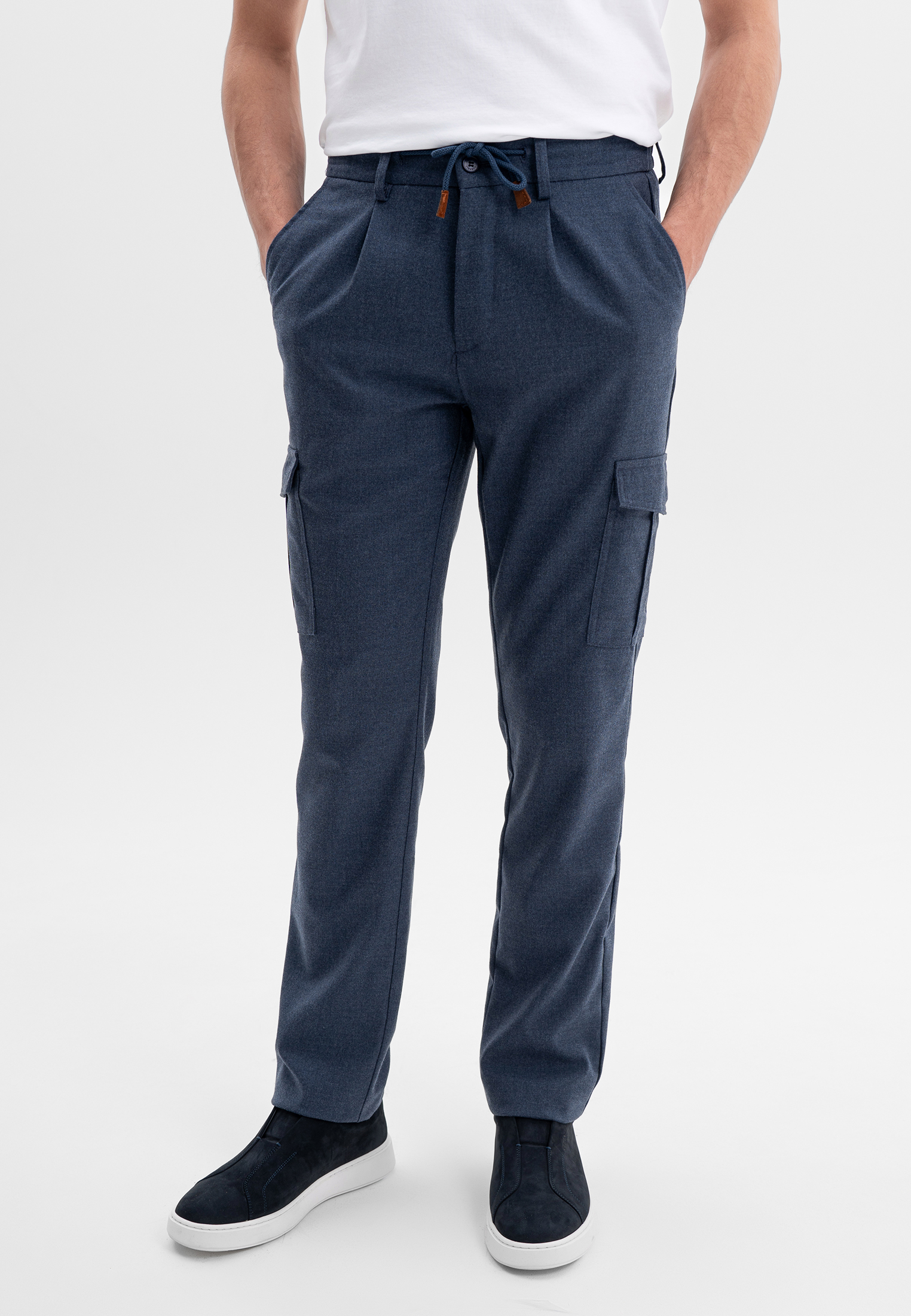 Синие брюки карго CORNELI выполнены из смесовой ткани на основе полиэстера и вискозы с добавлением спандекса. Материал мягкий, износостойкий и хорошо держит форму, обеспечивая комфорт в течение дня. Функциональные боковые карманы и эластичный пояс со шнурком формируют удобную посадку и подчёркивают современный, утилитарный характер модели. Подходят для повседневных и smart-casual образов.