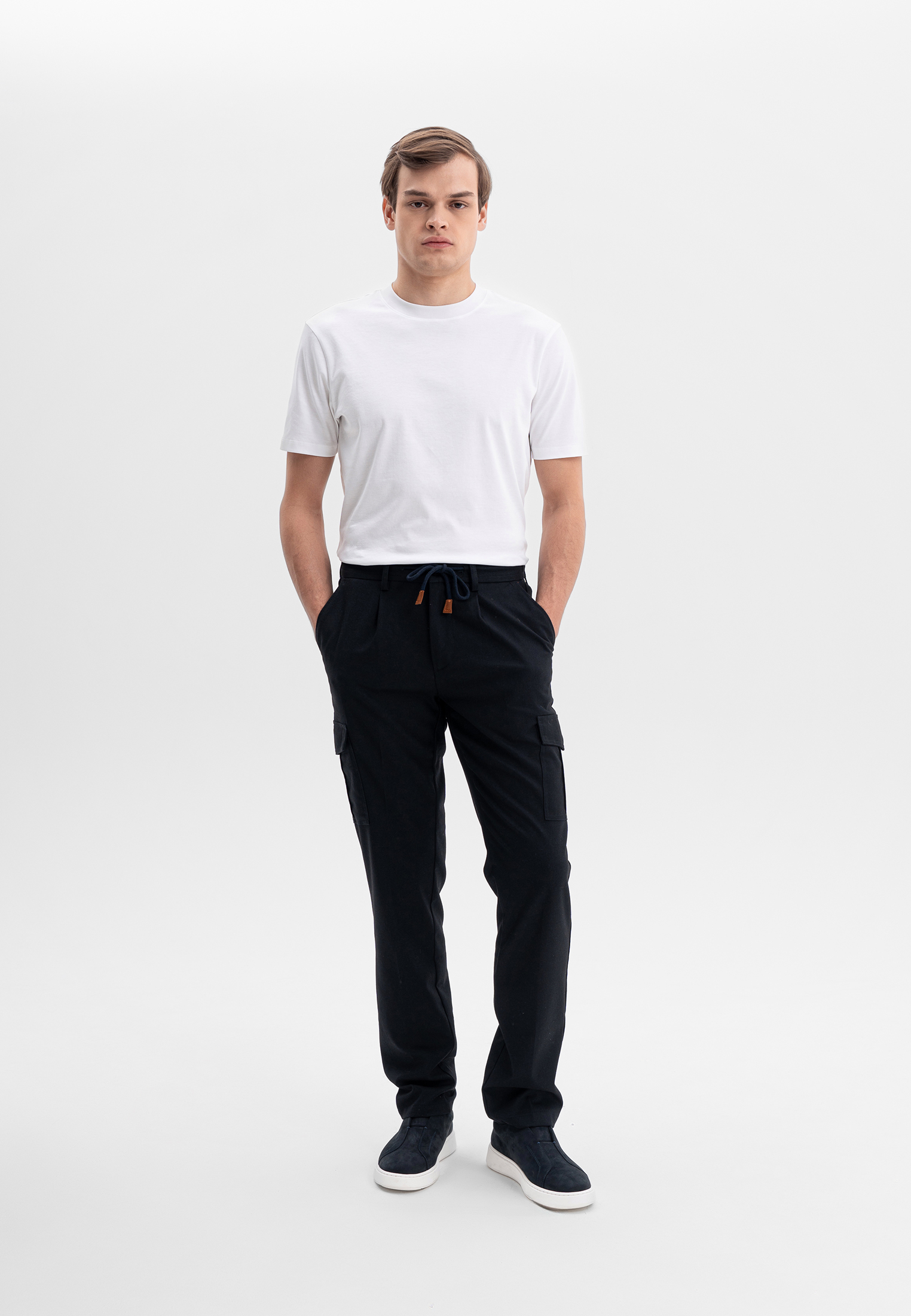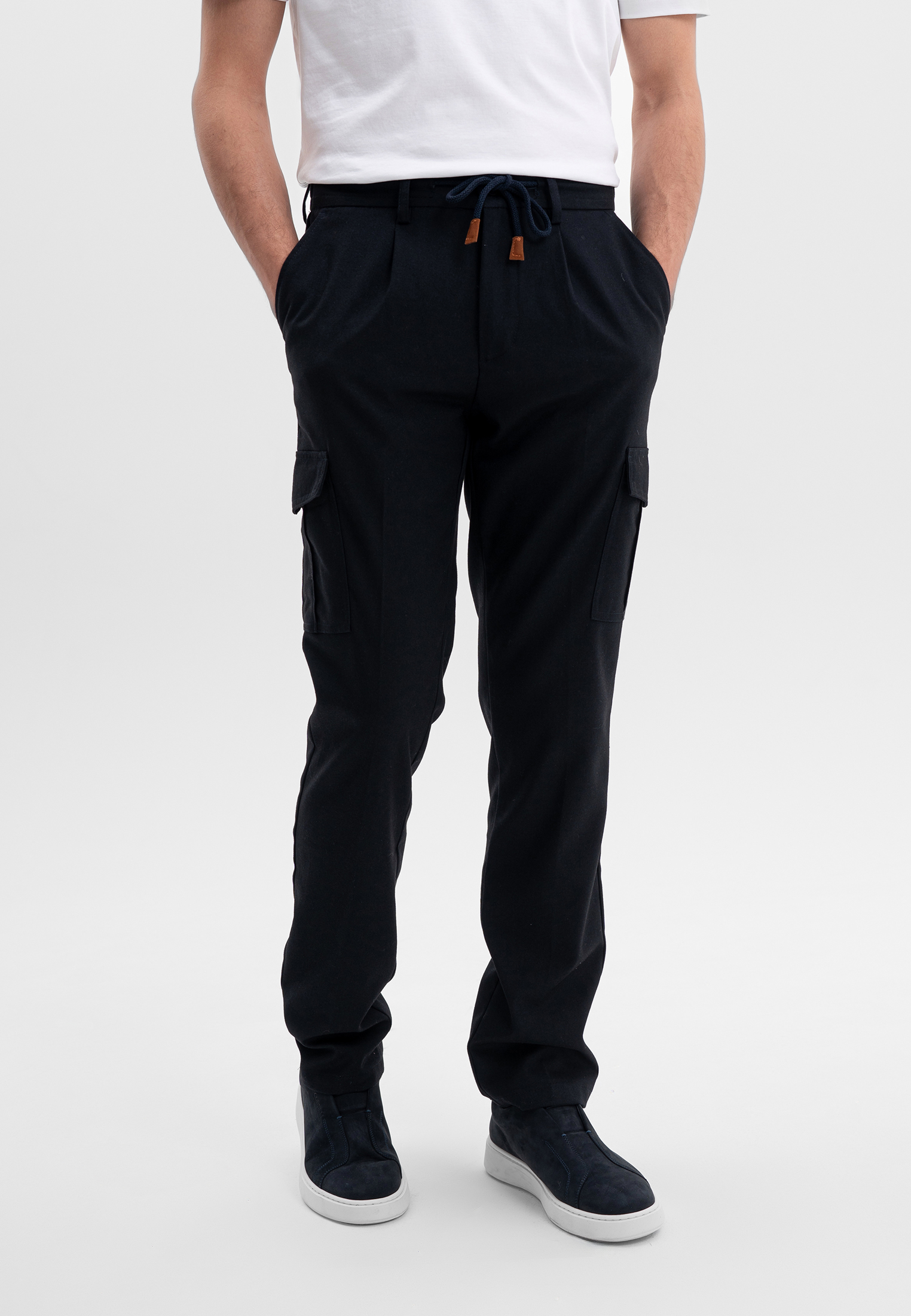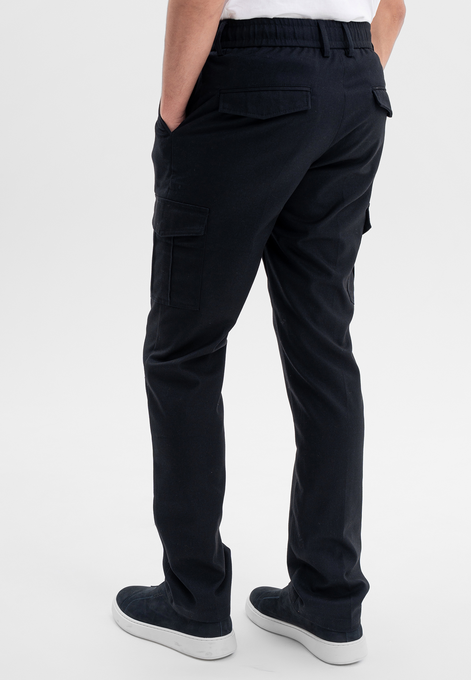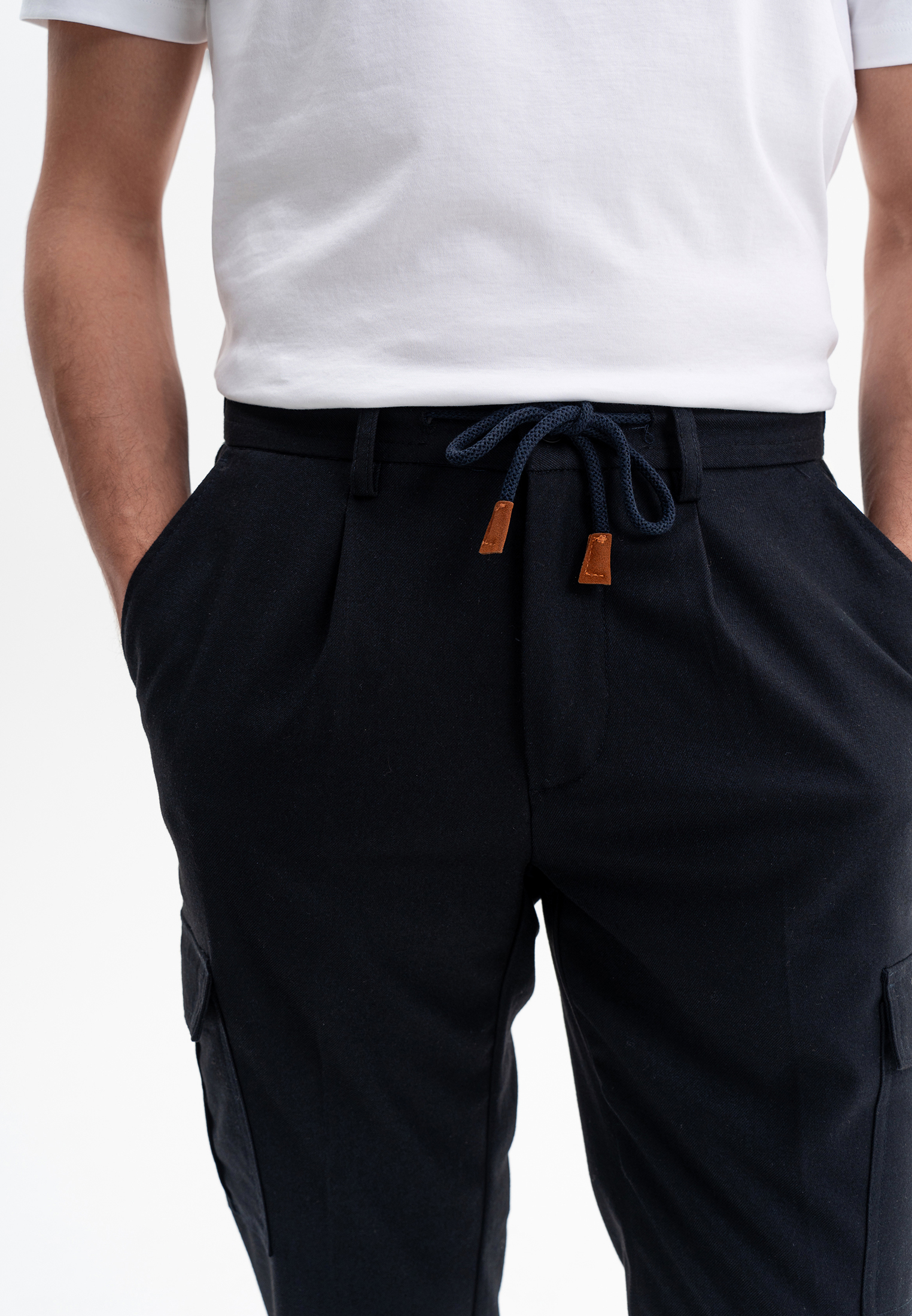 Брюки карго CORNELI тёмно-синего цвета выполнены из смесовой ткани на основе полиэстера и вискозы с добавлением спандекса. Материал мягкий, износостойкий и хорошо держит форму, обеспечивая комфорт в течение дня. Функциональные боковые карманы и лаконичный крой подчёркивают современный характер модели. Универсальный вариант для повседневных и smart-casual образов.