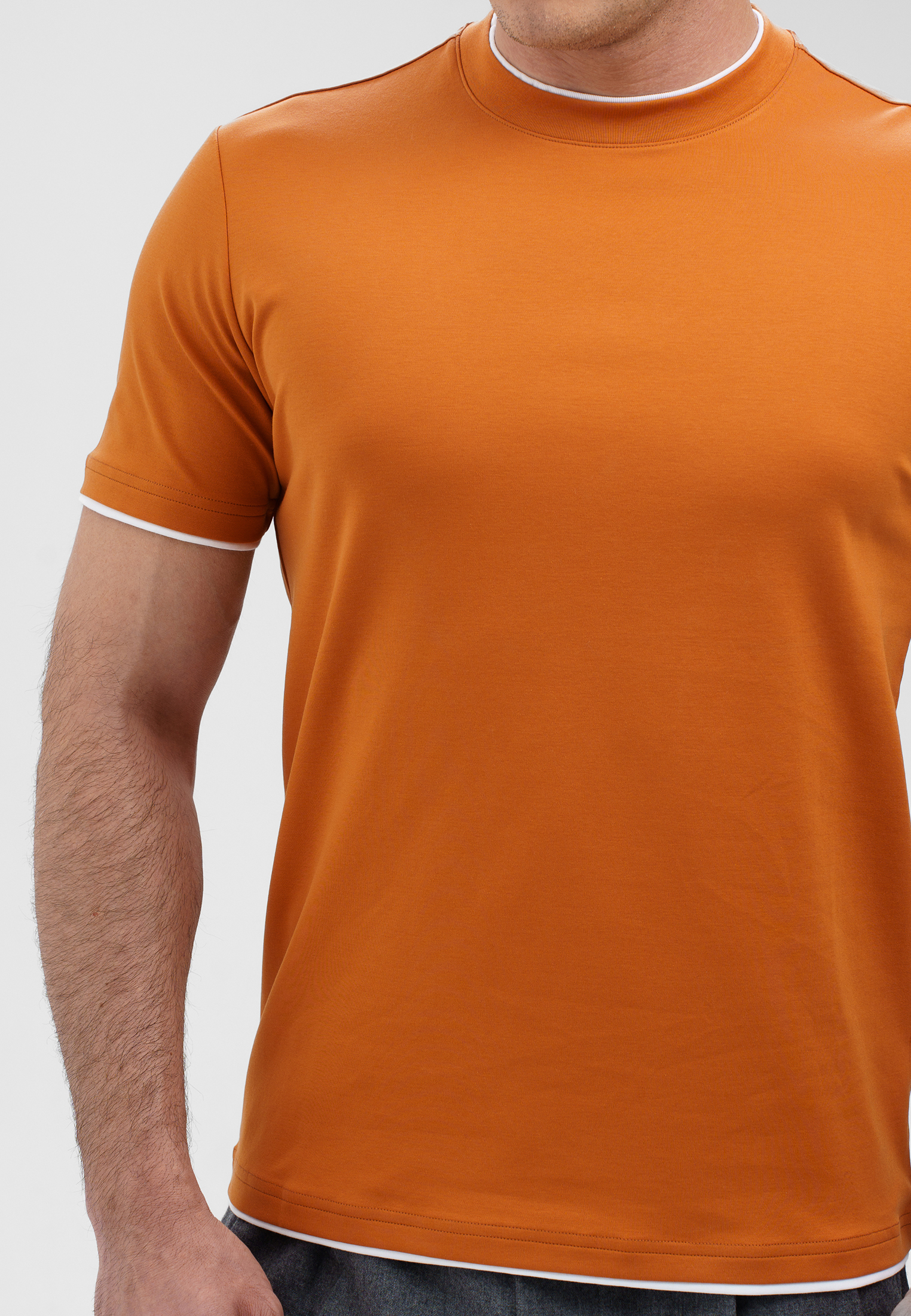 Футболка оранжевого цвета. Модель выполнена из мягкого хлопкового полотна с добавлением спандекса, что обеспечивает комфорт и лёгкую эластичность. Классический прямой крой и контрастные белые канты по горловине и рукавам придают изделию аккуратный, современный вид. Отлично сочетается как с брюками, так и с джинсами для повседневного образа.