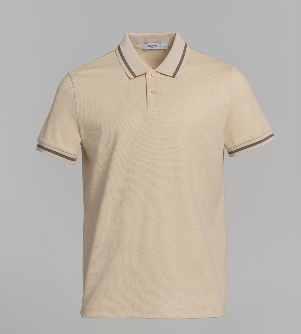 Поло прямого кроя из хлопкового трикотажа. Отложной воротник и края рукавов с контрастной отделкой. Короткие рукава. Эластичные края. Застежка на пуговицы на планке.