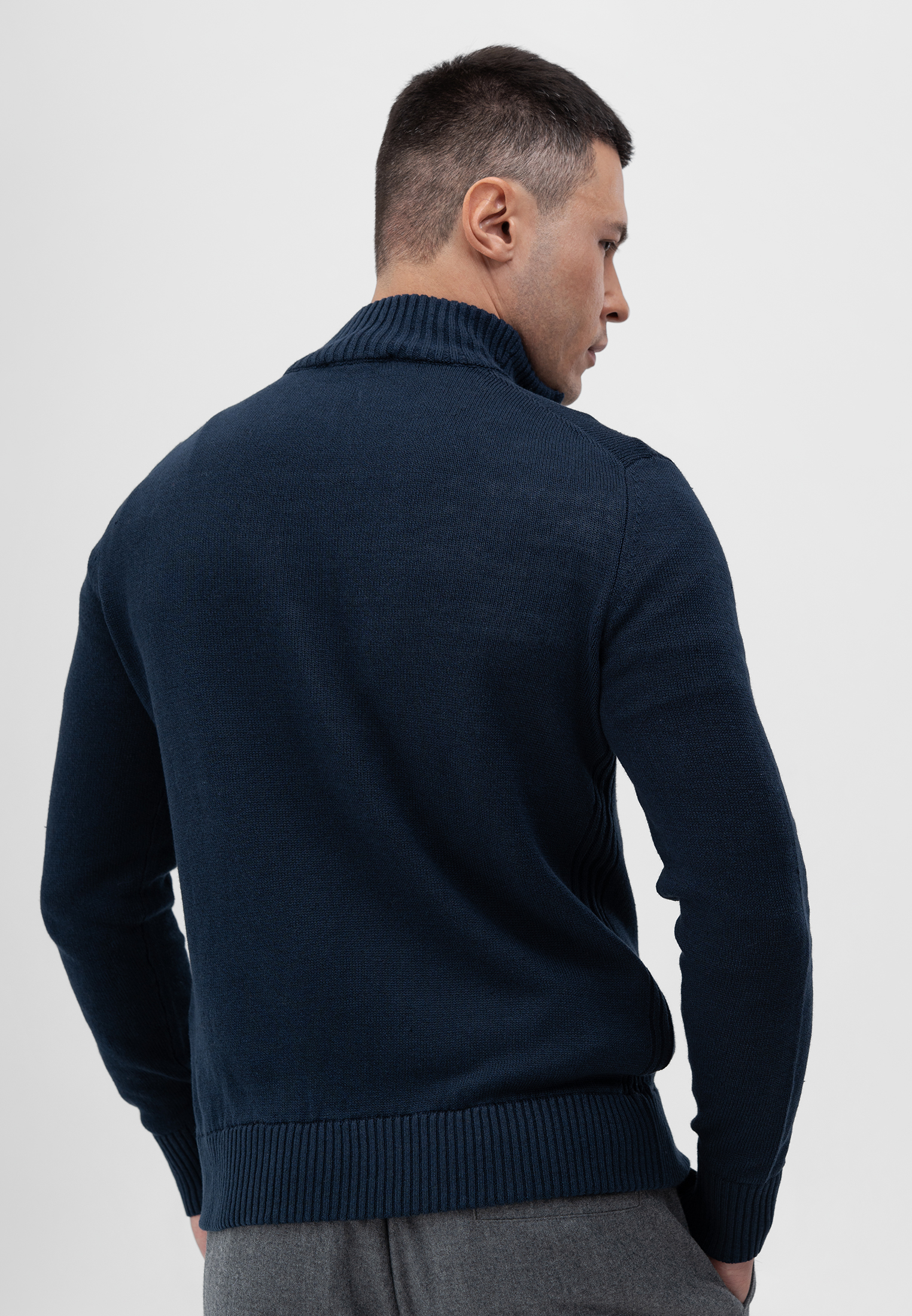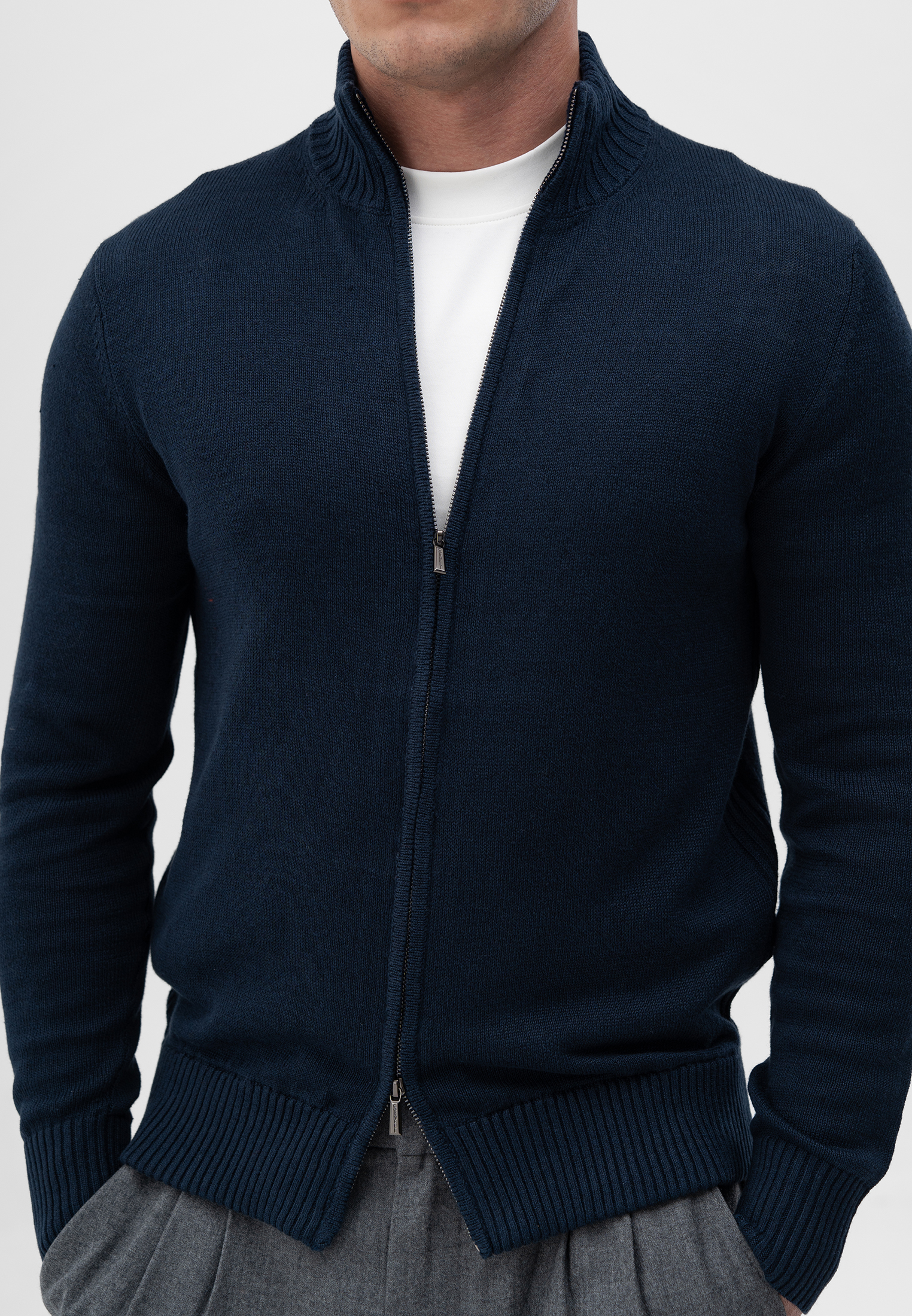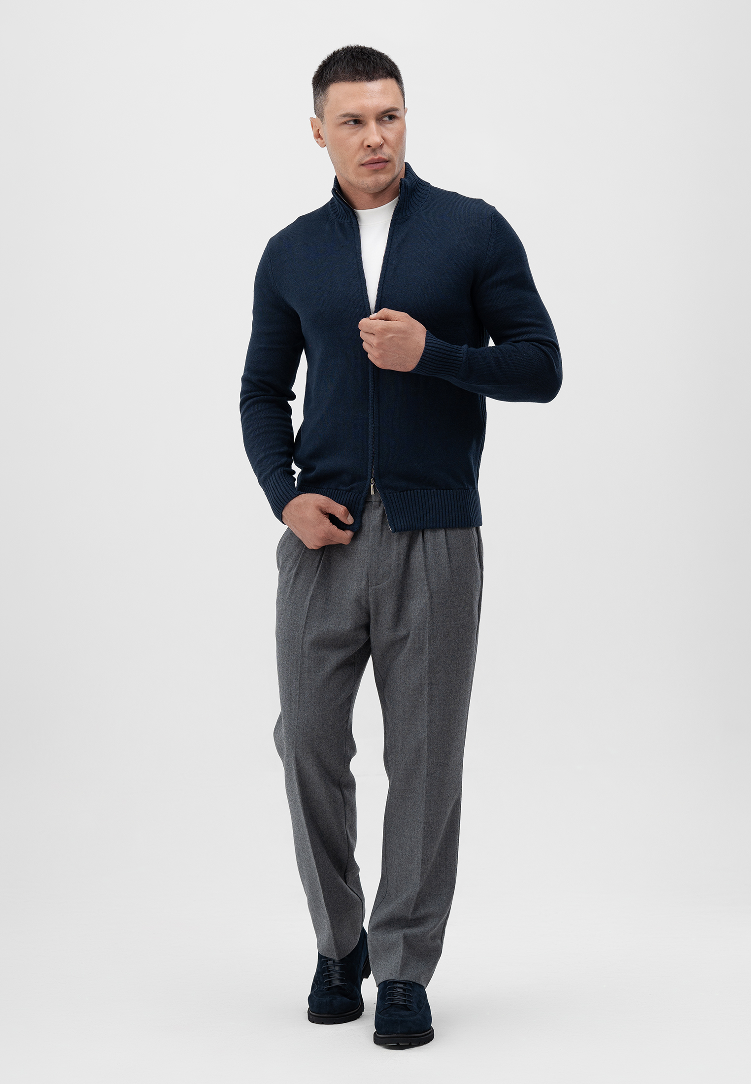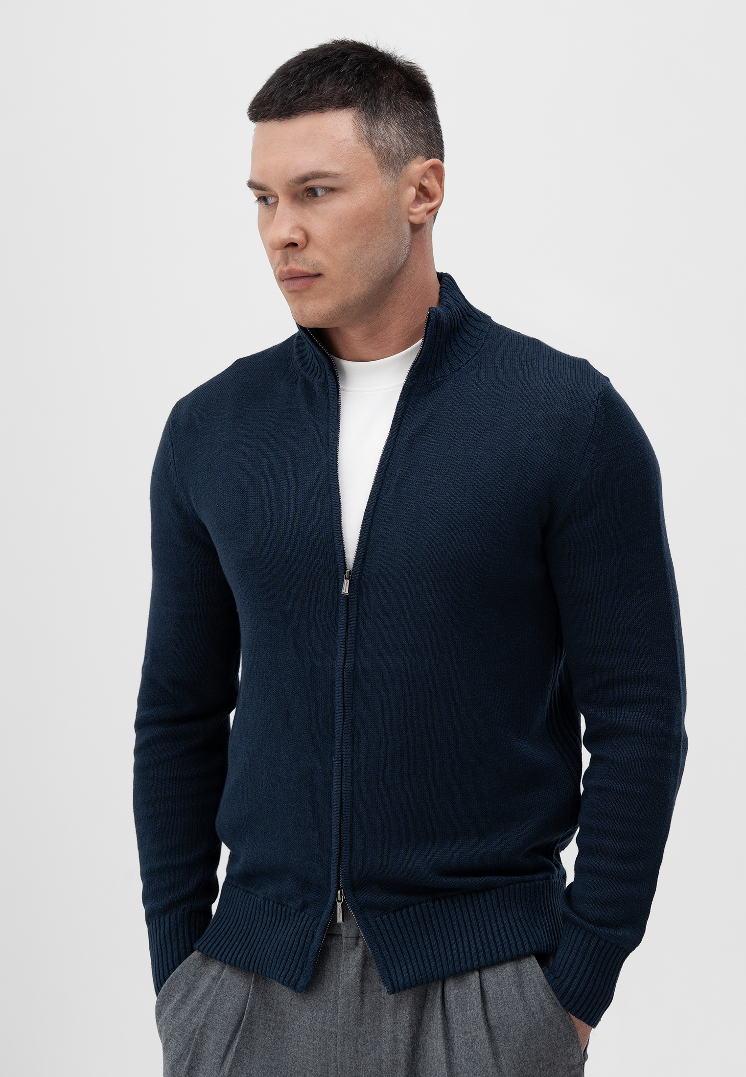 Кардиган темно-синего цвета. Выполнен из смеси льна и хлопка, что делает изделие легким, воздухопроницаемым и комфортным для повседневной носки. Модель прямого кроя с воротником-стойкой и застежкой на двустороннюю молнию. Манжеты и низ оформлены широкой резинкой, обеспечивающей удобную посадку и сохранение формы.