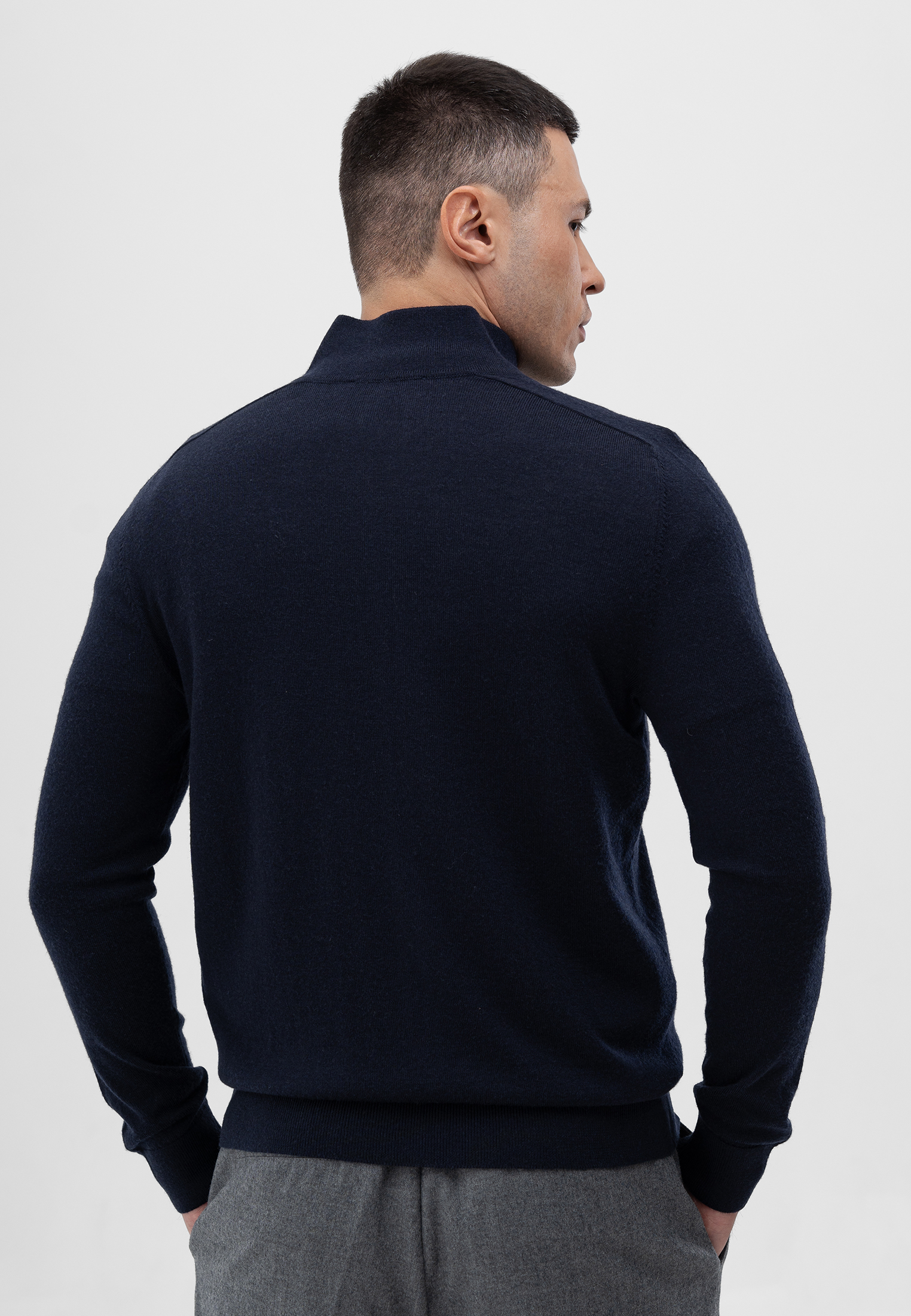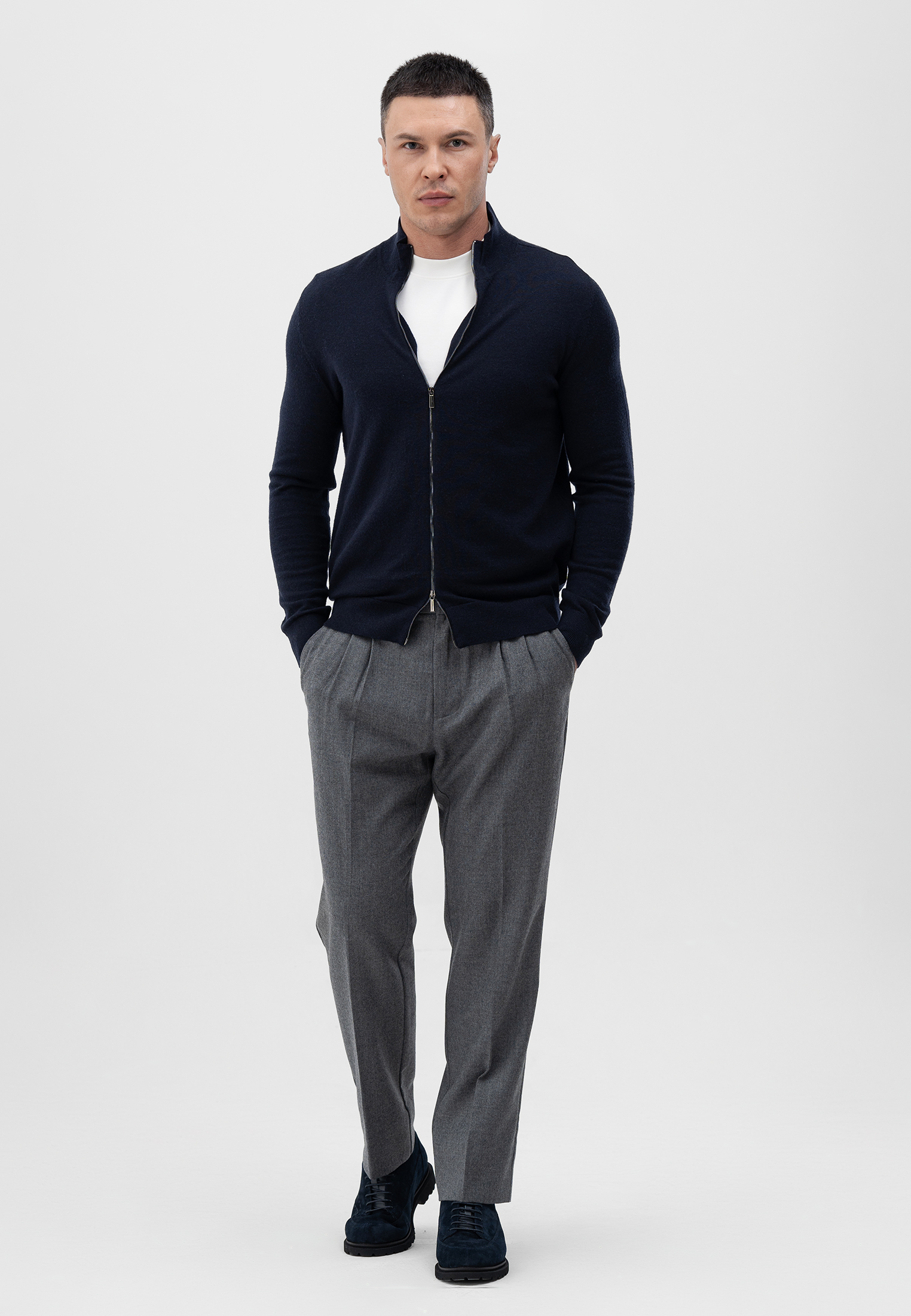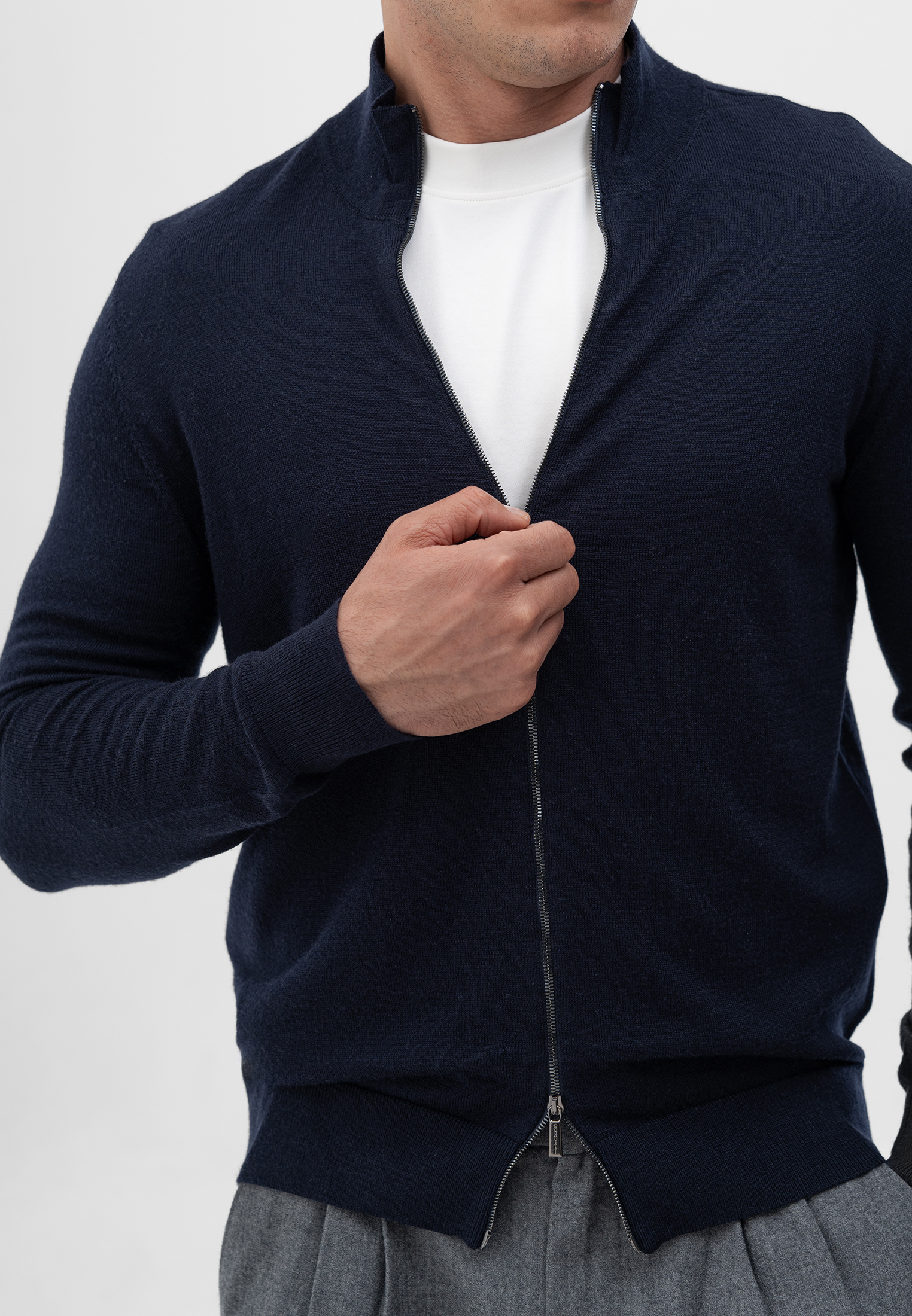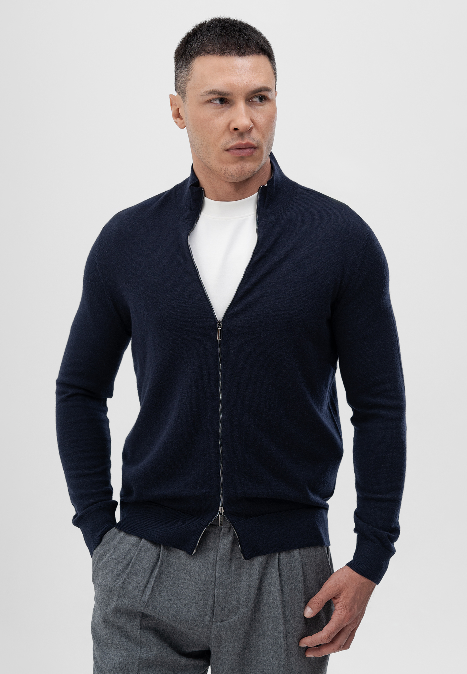 Кардиган темно-синего цвета. Выполнен из мягкой 100% шерсти. Модель прямого кроя с воротником-стойкой и застежкой на двустороннюю молнию. Манжеты и низ изделия оформлены эластичной резинкой для комфортной посадки. Натуральная шерсть сохраняет тепло и обеспечивает комфорт в прохладное время года. Лаконичный дизайн делает кардиган универсальным элементом базового гардероба.