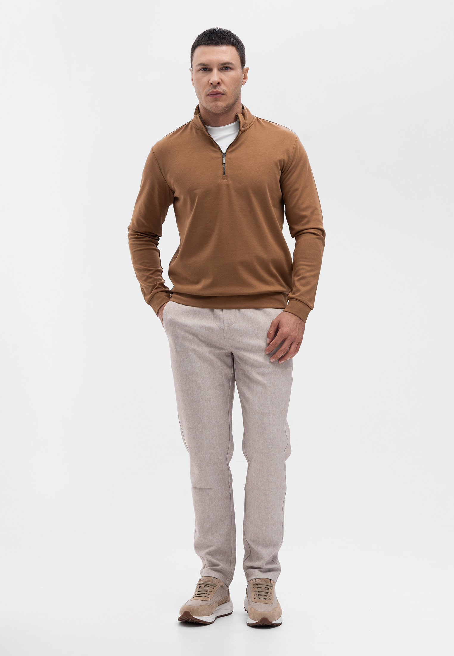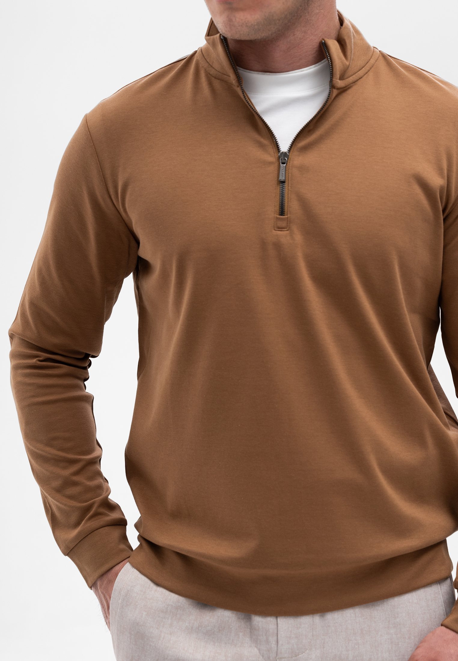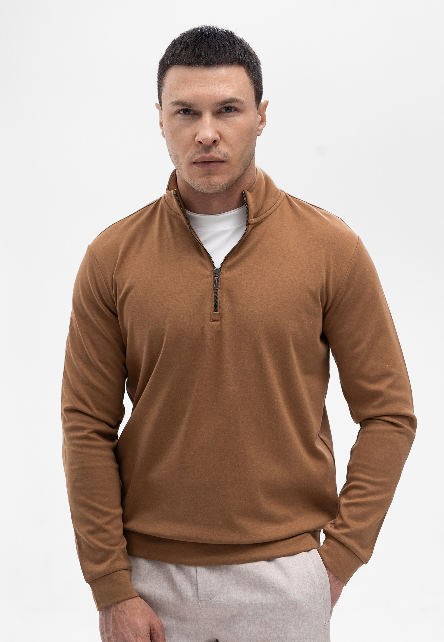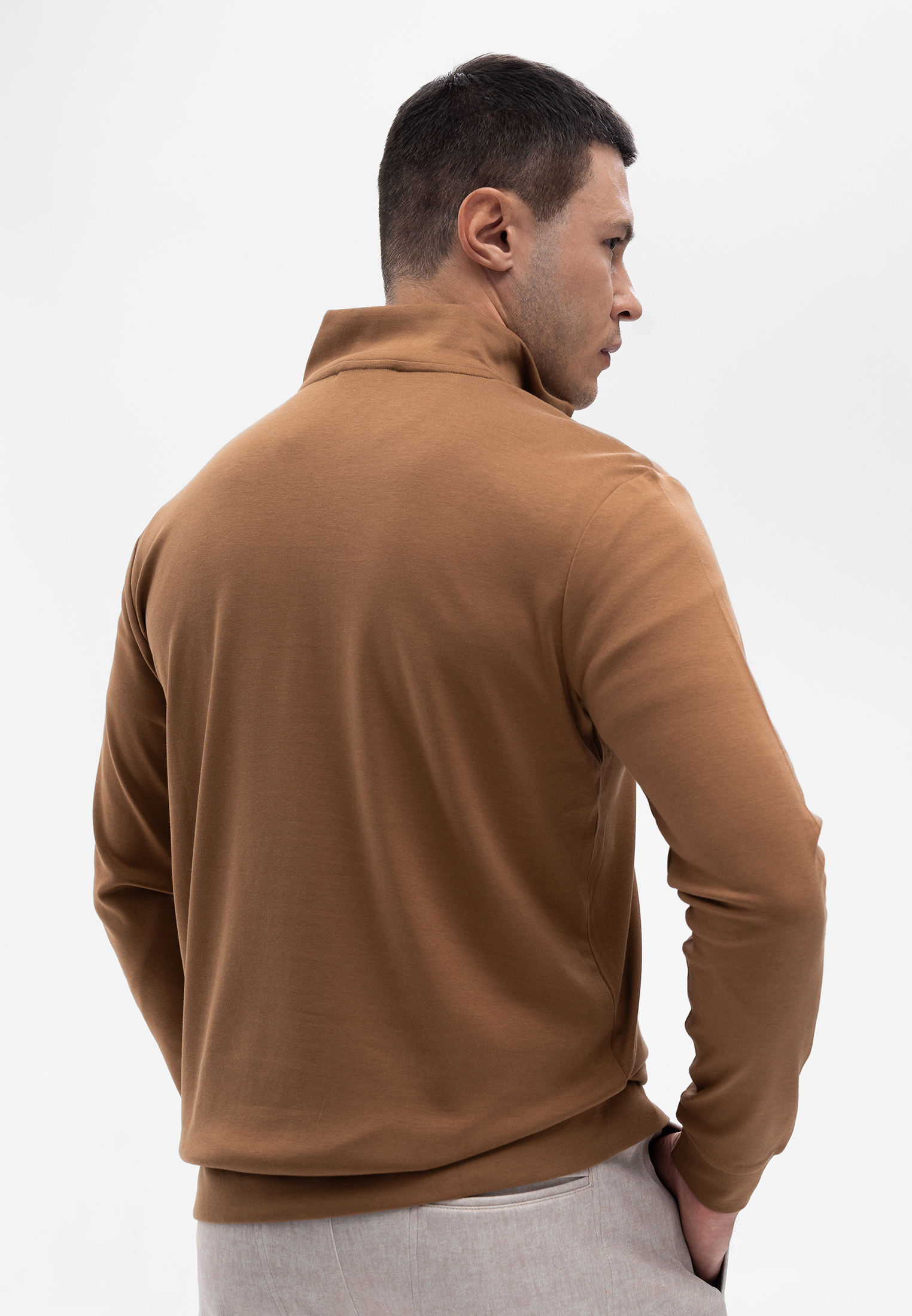 Коричневый лонгслив с воротником-стойкой на короткой молнии. Модель выполнена из мягкого, эластичного и дышащего материала, обеспечивающего комфорт в носке. Благодаря сочетанию хлопка и модала изделие приятно к телу, а спандекс придаёт ткани лёгкую растяжимость, сохраняя форму. Универсальный вариант для повседневных образов в стиле smart casual.