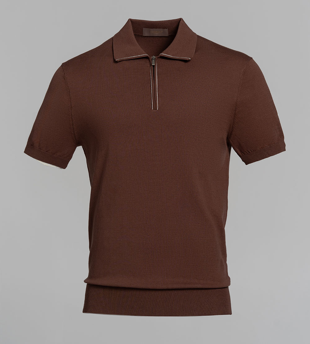 Поло прямого кроя из мягкого трикотажа. Отложной воротник. Короткие рукава. Эластичные края. Застежка на молнию.