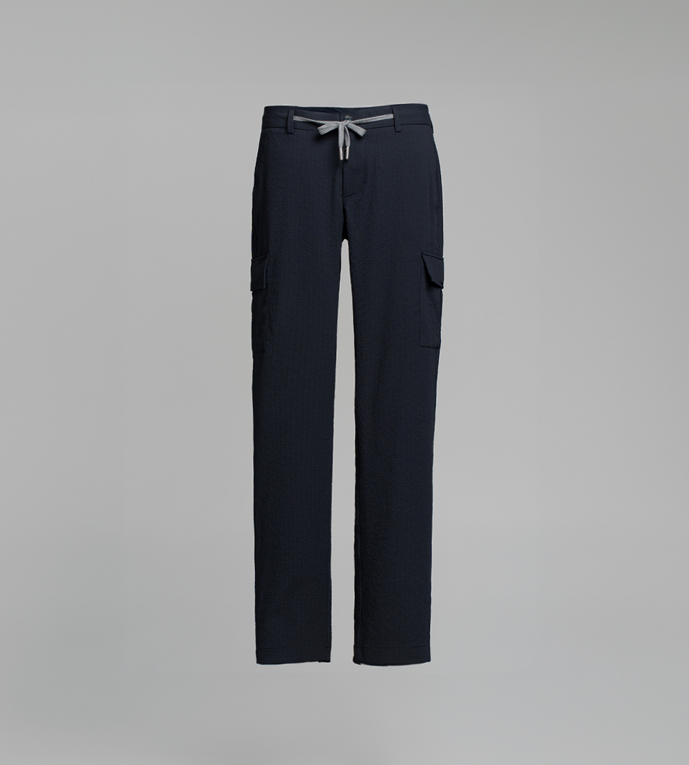 Брюки прямого кроя из полиамида с эластаном. Пояс со шнурком. Боковые прорезные карманы. Накладные карманы на бёдрах.