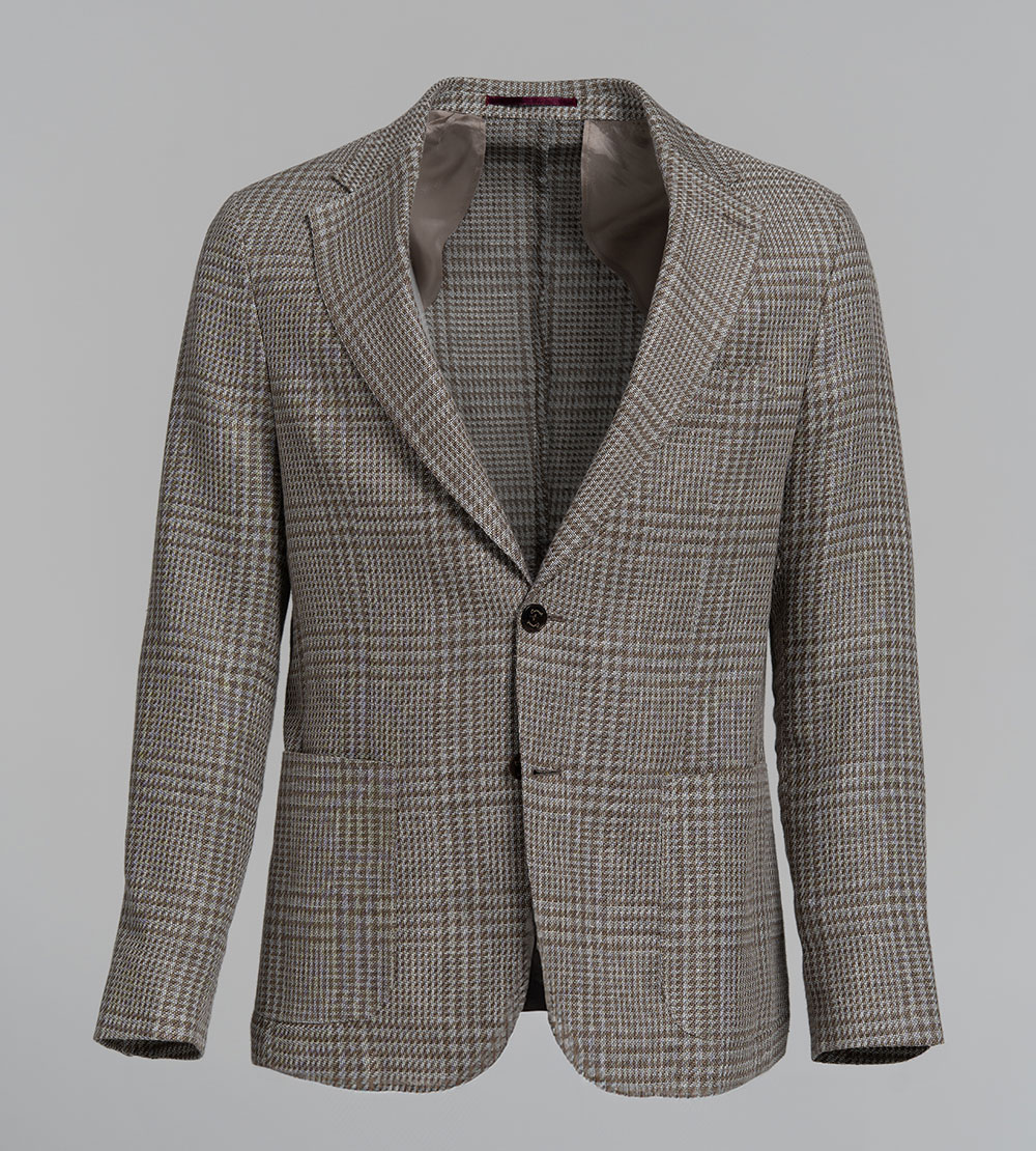 Пиджак прямого кроя из смесового льна и хлопка. Однобортная модель. Отложной воротник с лацканами. Застежка на одну пуговицу. Боковые карманы с клапанами. Декорирован узором в клетку.