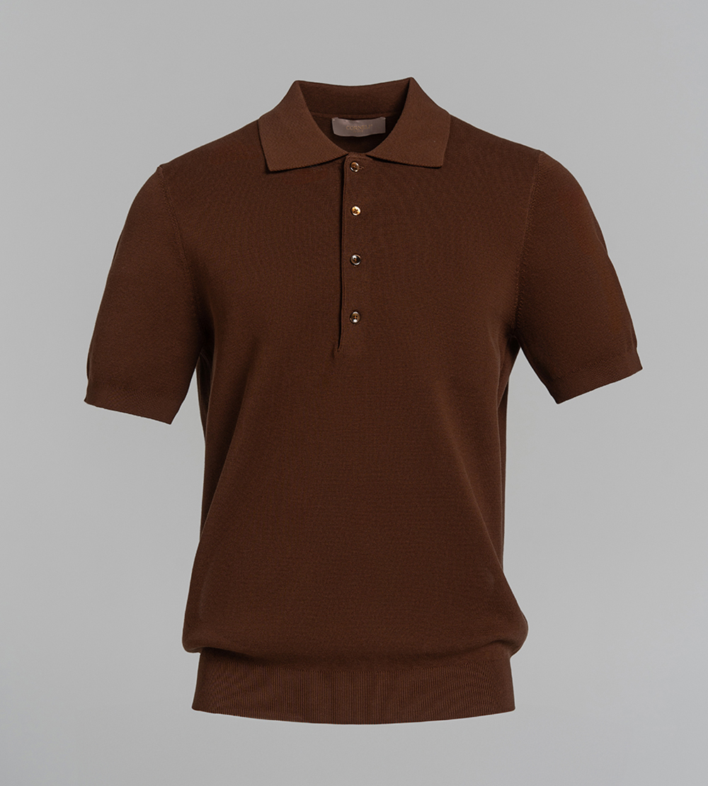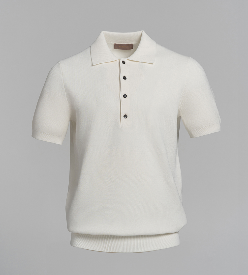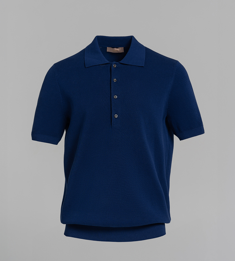 Поло прямого кроя из хлопкового трикотажа. Отложной воротник. Короткие рукава. Эластичные края. Застежка на пуговицы на планке.