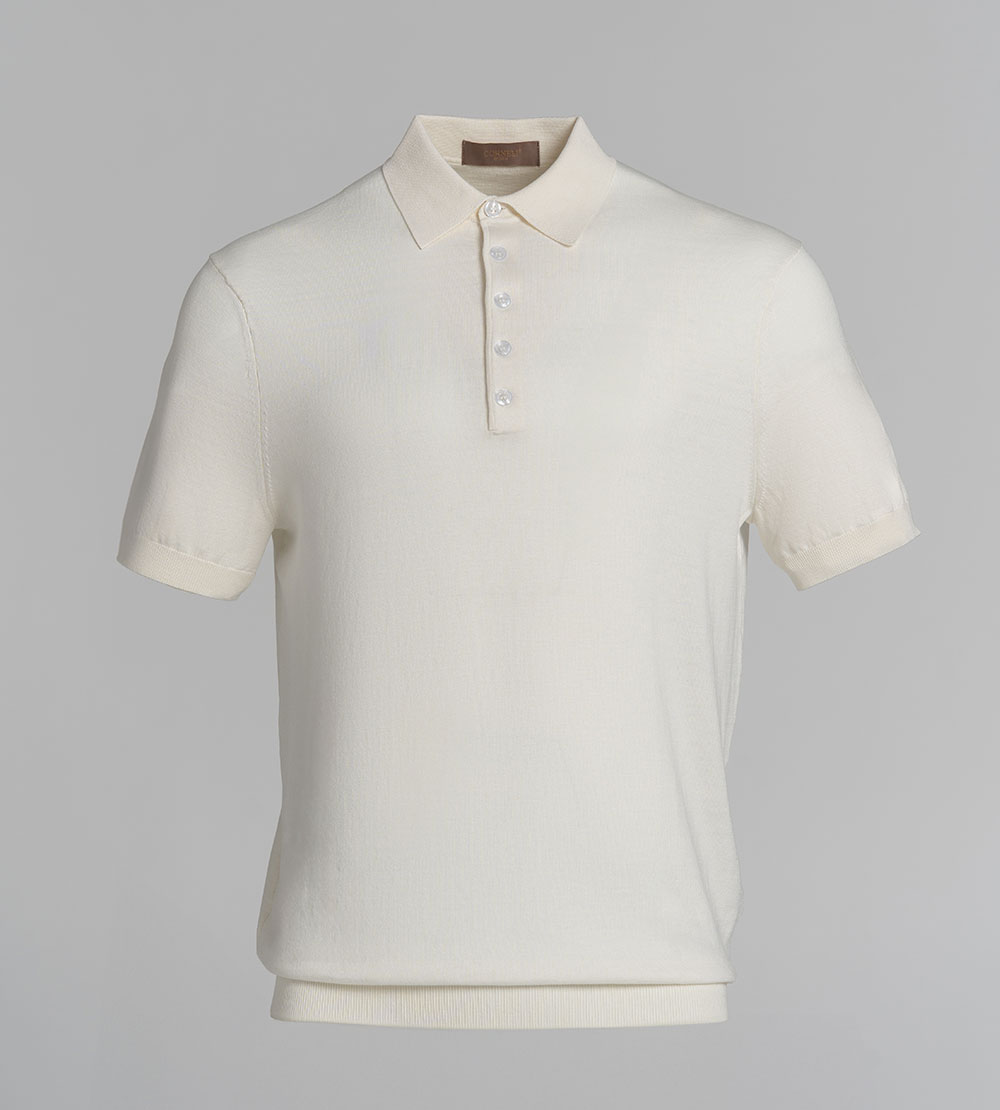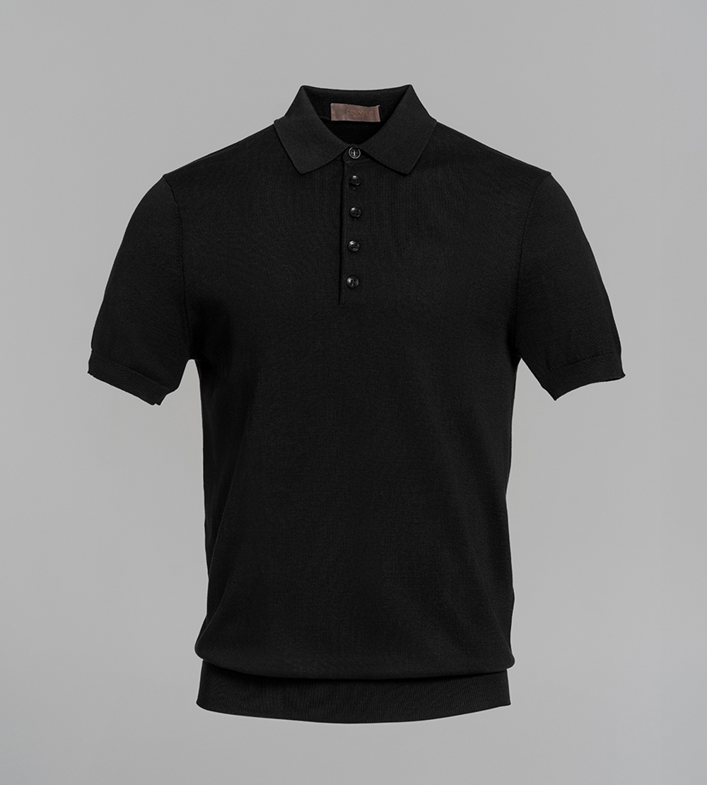 Поло прямого кроя из тонкого трикотажа. Отложной воротник. Короткие рукава. Застежка на пуговицы на планке.