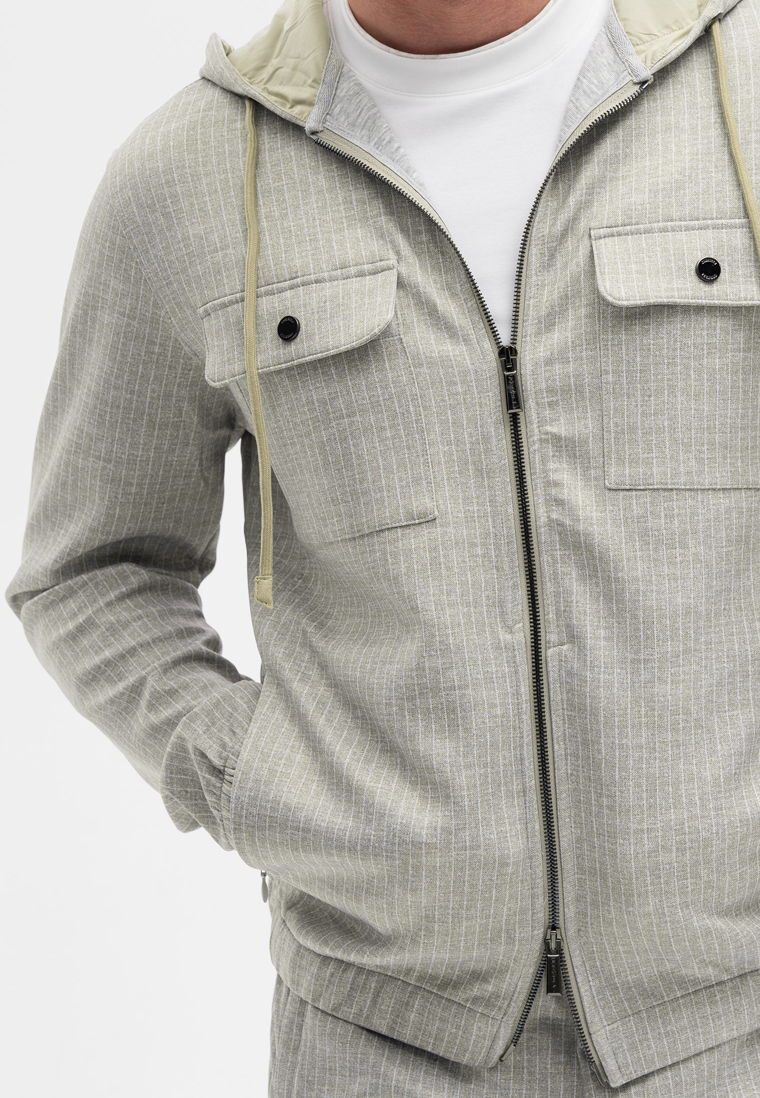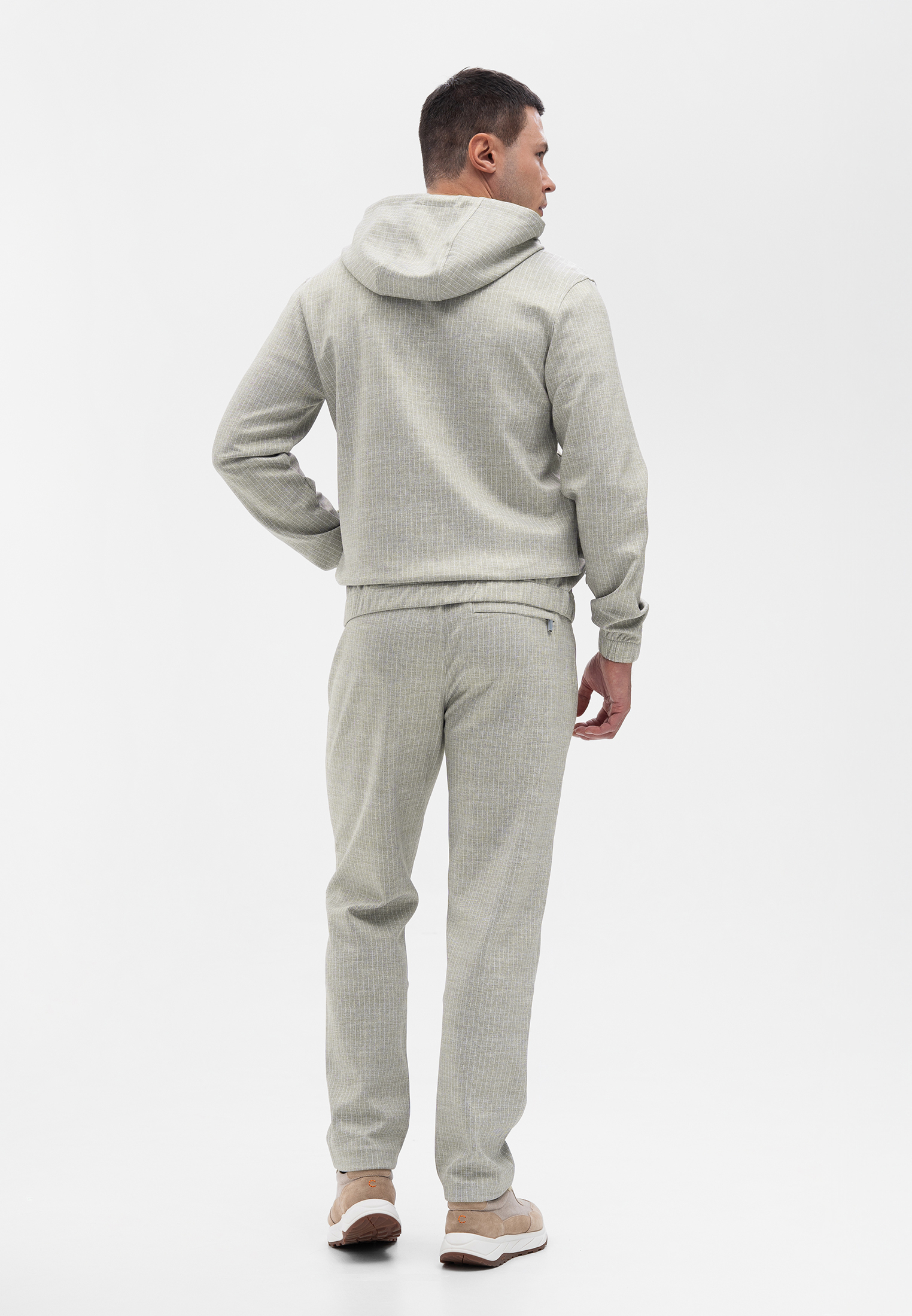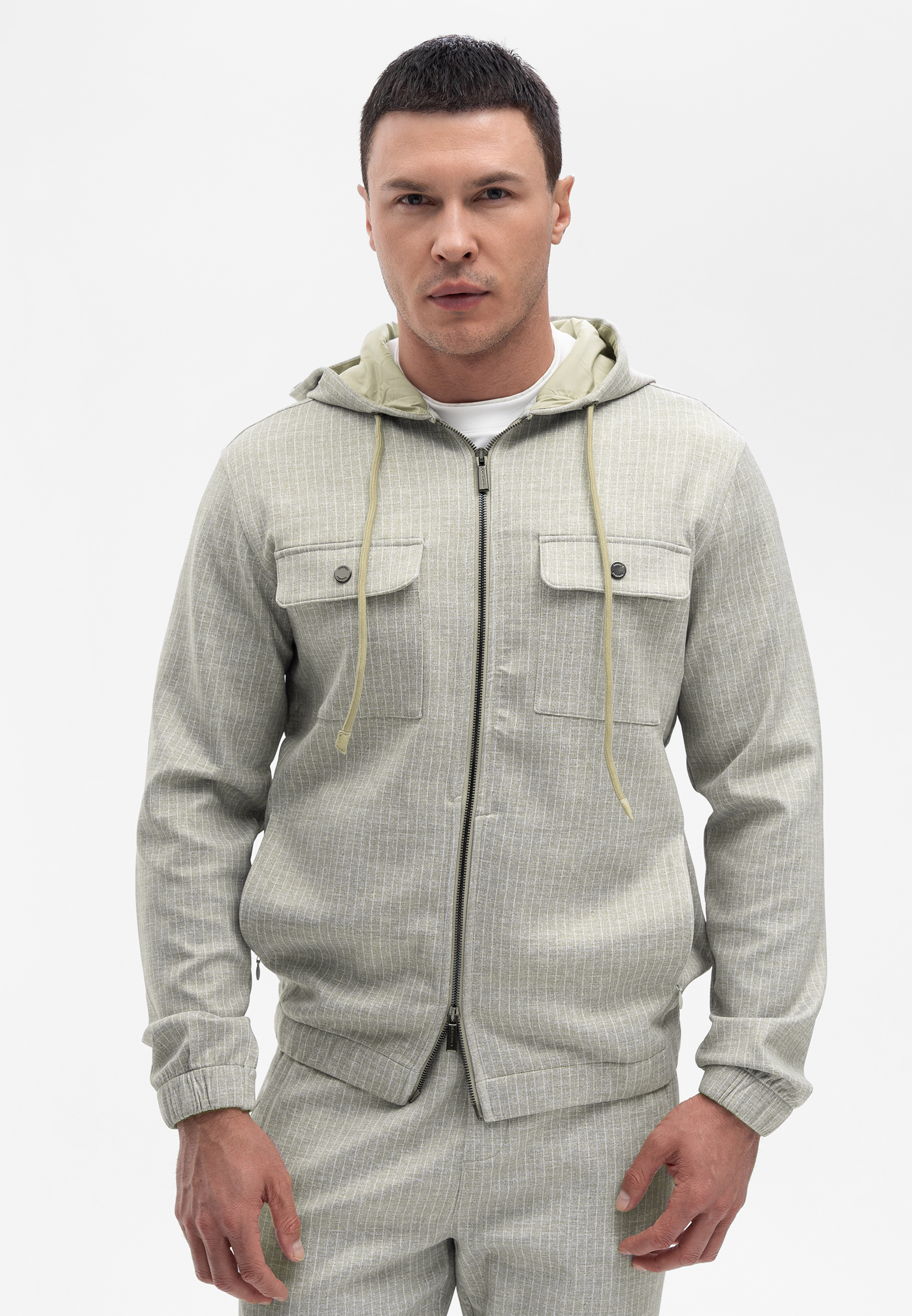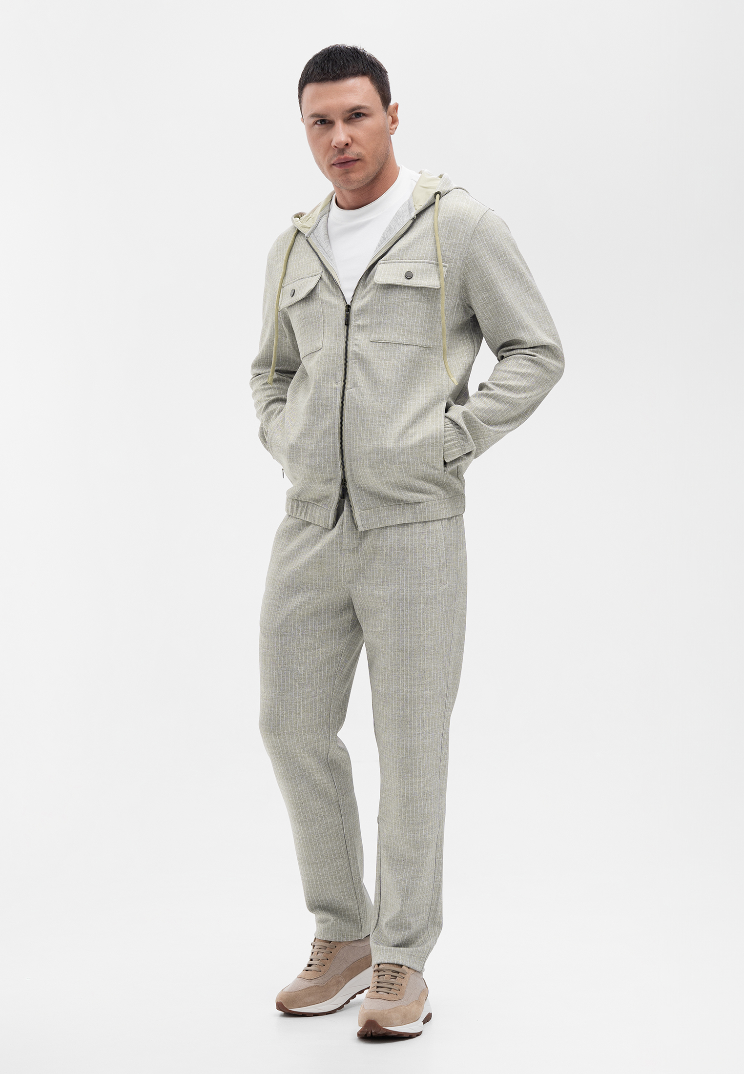 Прогулочная двойка со светло-зелёным оттенком. Комплект состоит из куртки с капюшоном и брюк прямого кроя. Куртка выполнена на молнии, с двумя накладными карманами на груди и кулиской на капюшоне. Брюки имеют комфортную посадку и прямой силуэт. Материал с добавлением вискозы и эластана приятен к телу, дышит и не теряет форму. Современный и удобный вариант для городского образа.