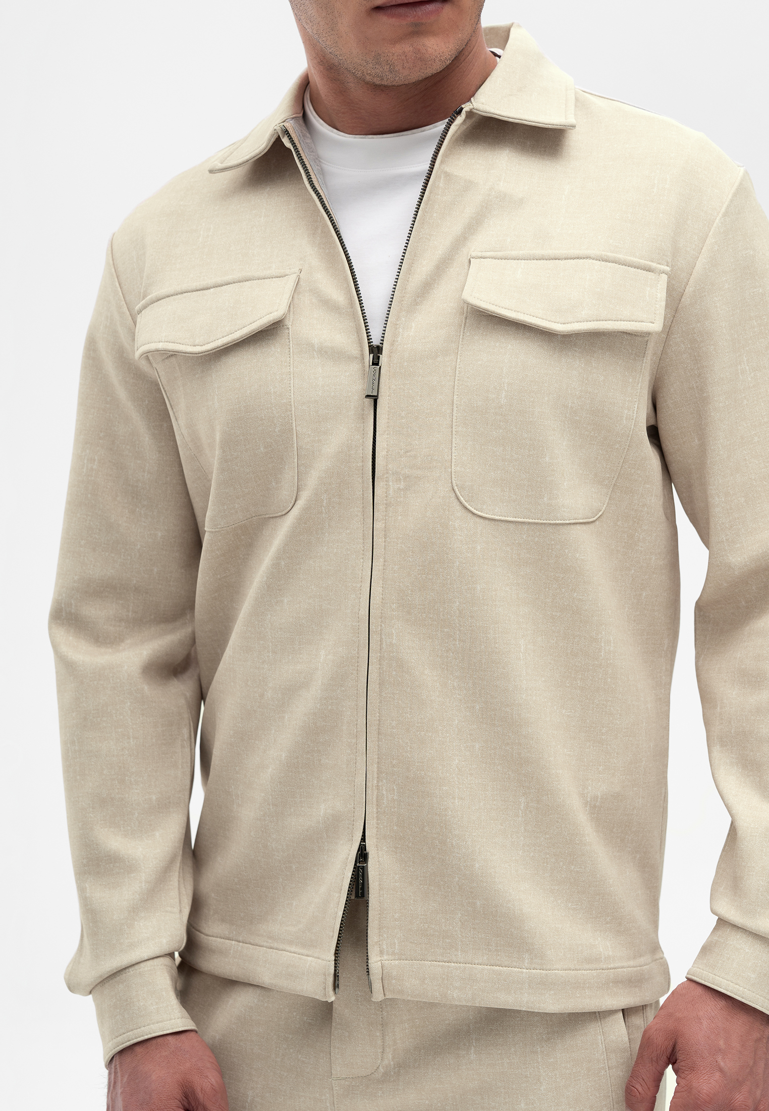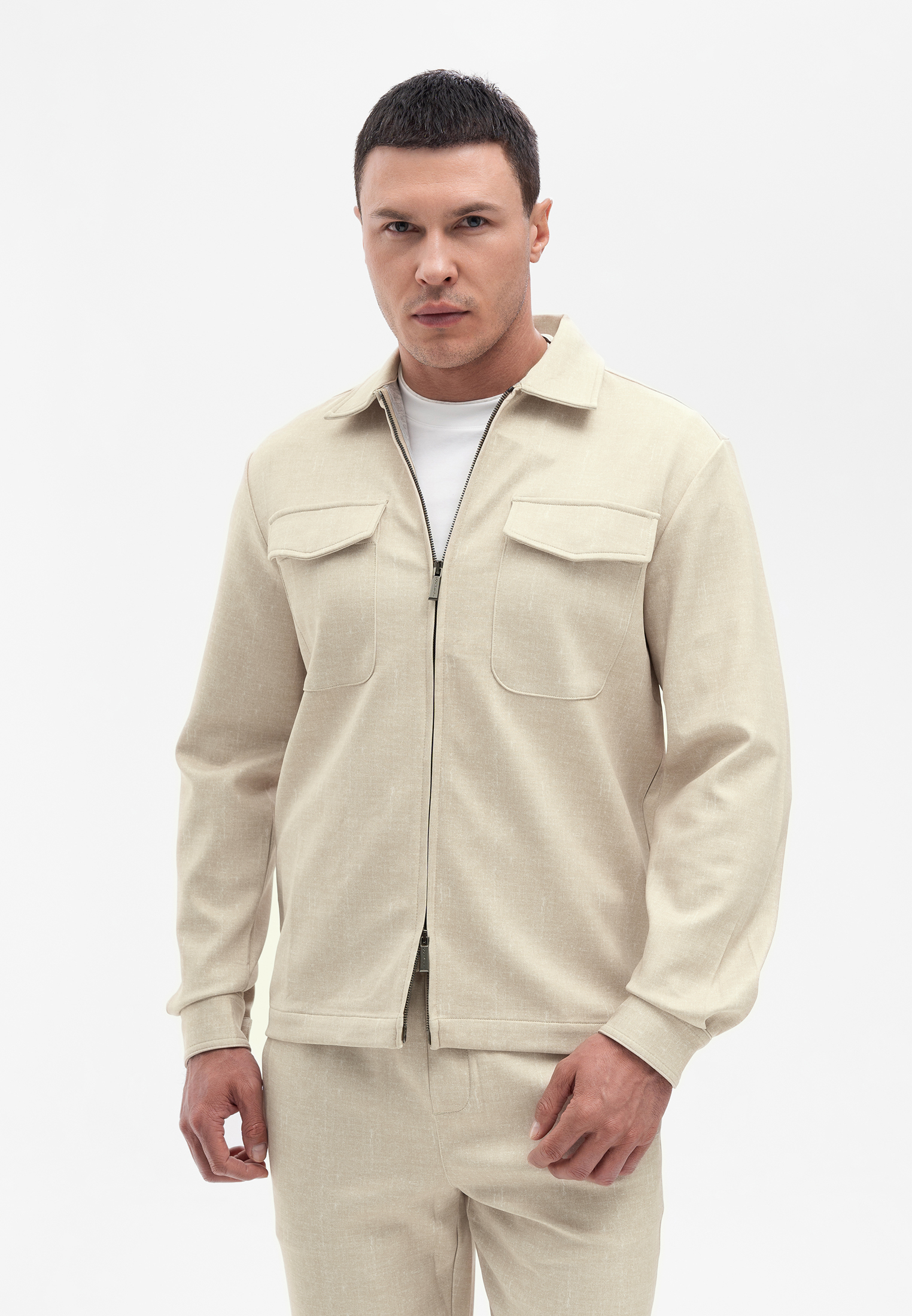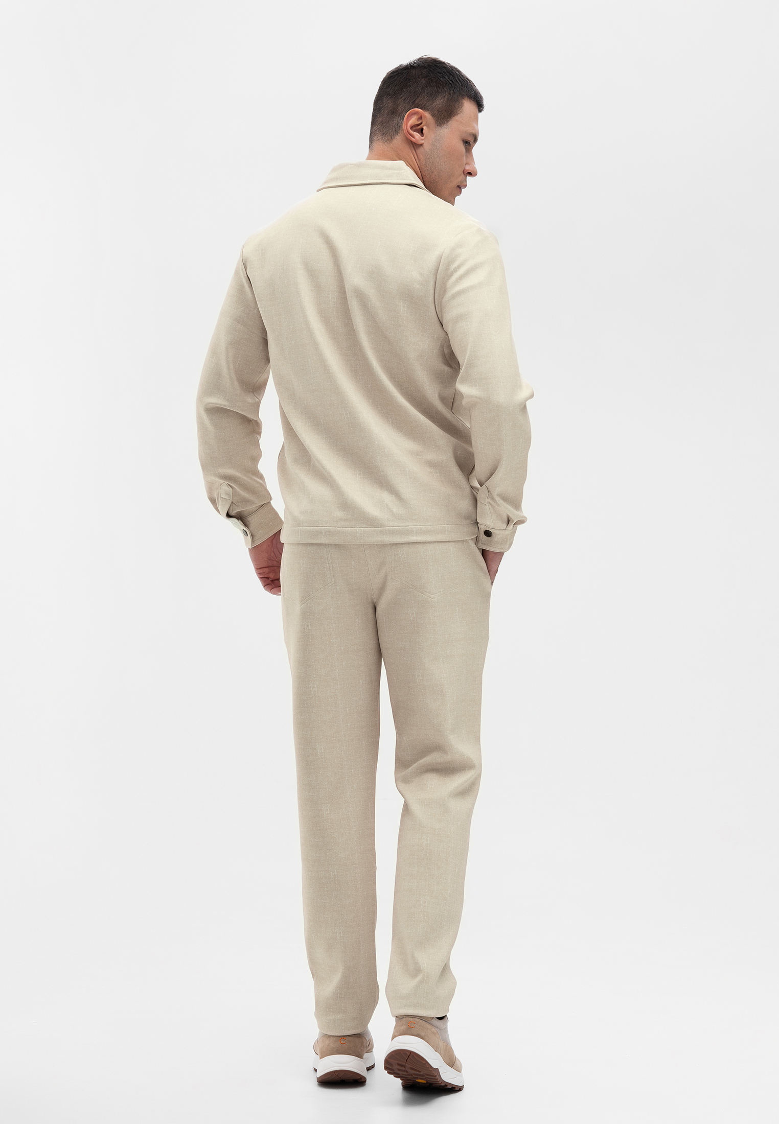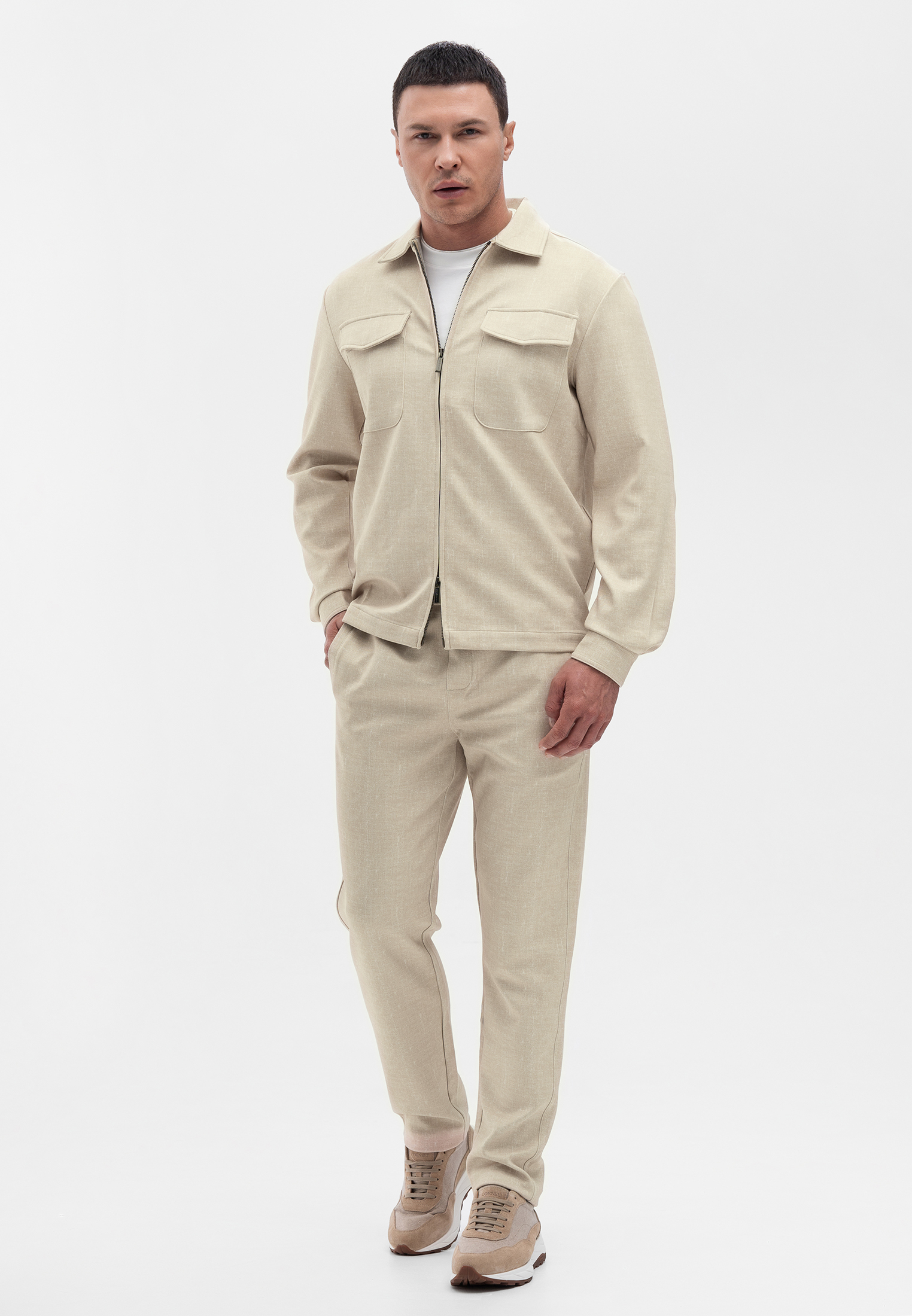 Прогулочный костюм бежевого цвета. Комплект состоит из куртки на молнии и брюк прямого кроя. Куртка выполнена с отложным воротником, боковыми карманами и клапанами на груди. Брюки со стрелками и комфортной посадкой. Материал с добавлением вискозы и эластана приятен на ощупь, не мнется и сохраняет форму, обеспечивая комфорт в течение дня. Универсальный вариант для городских и повседневных образов.