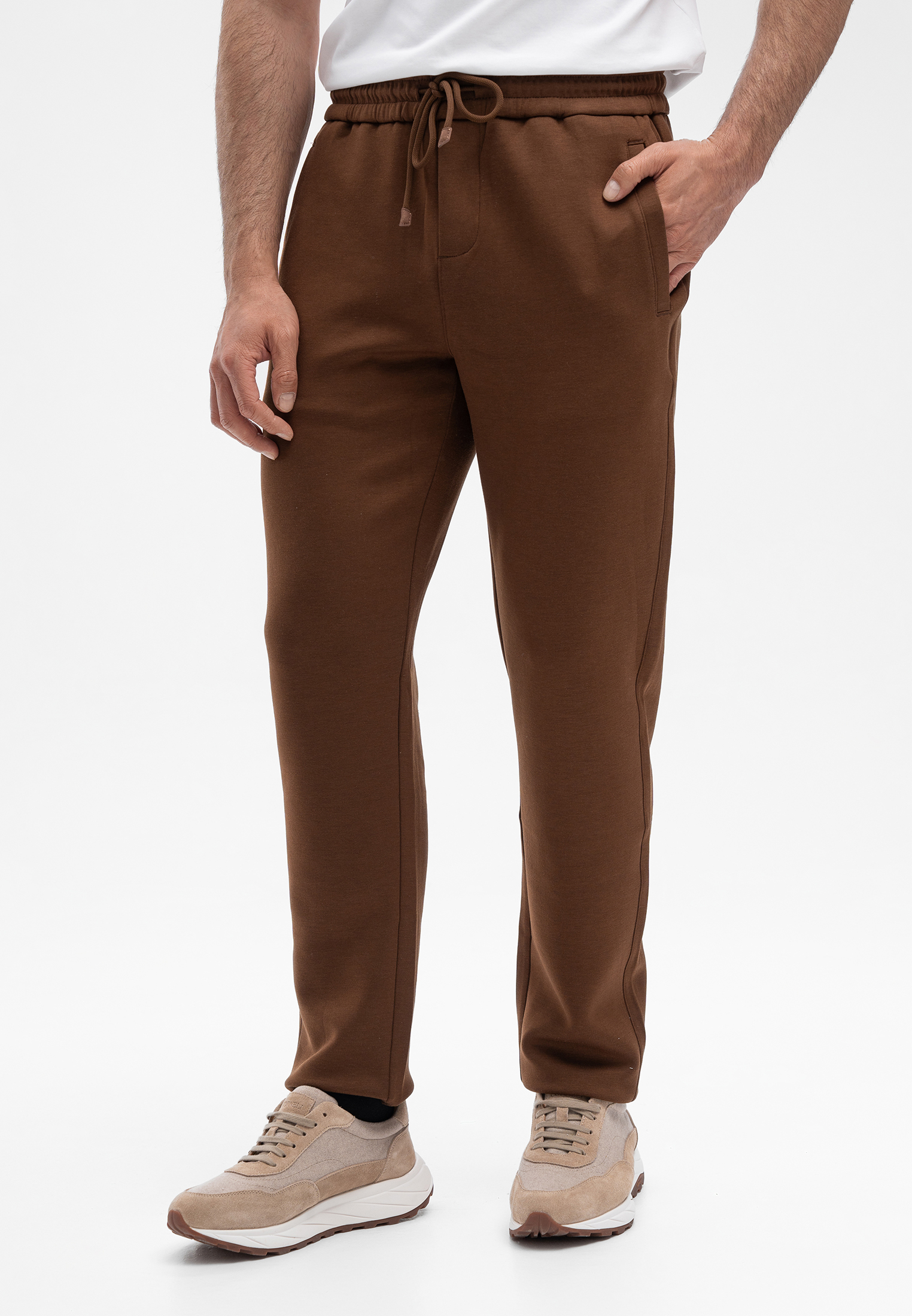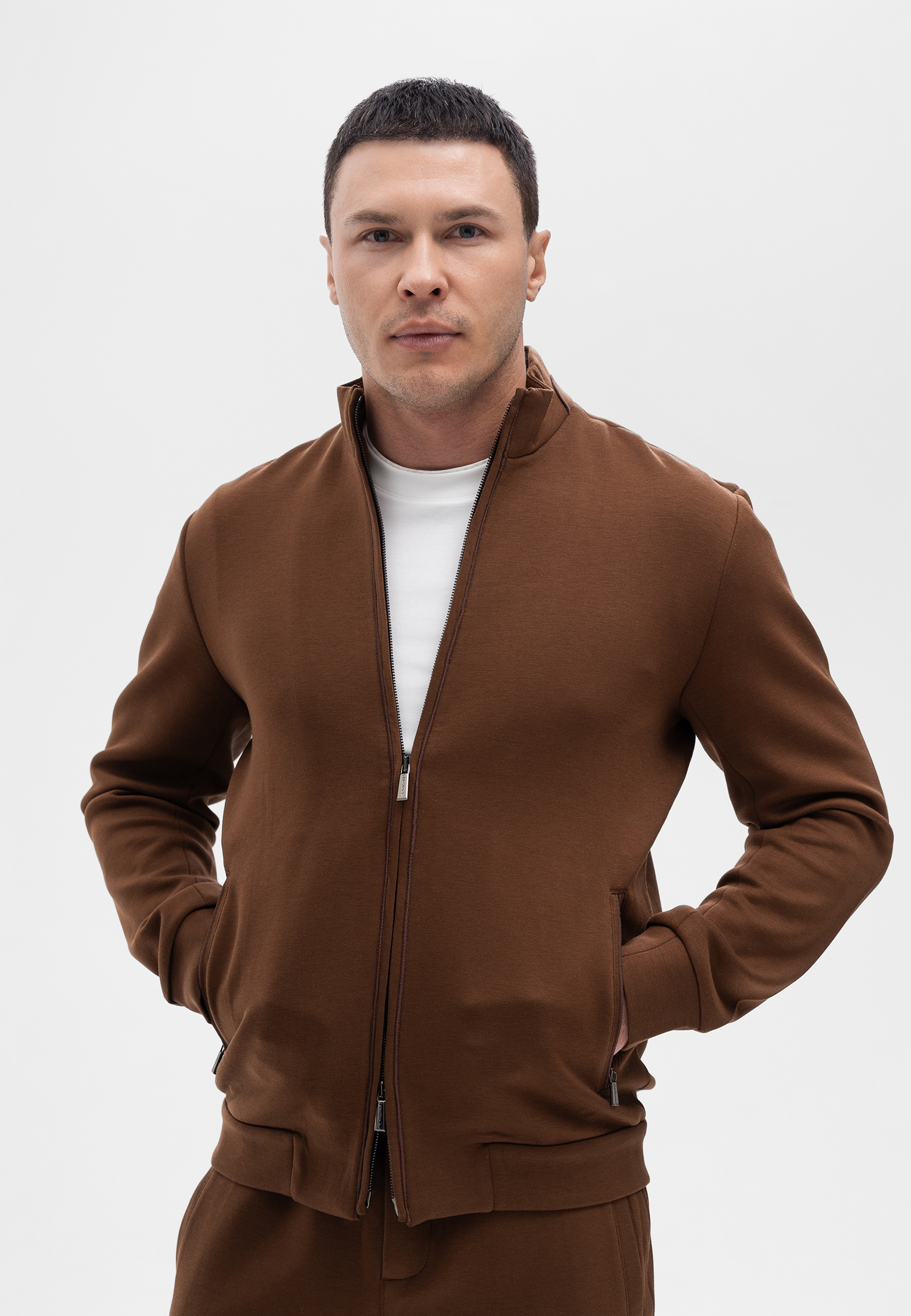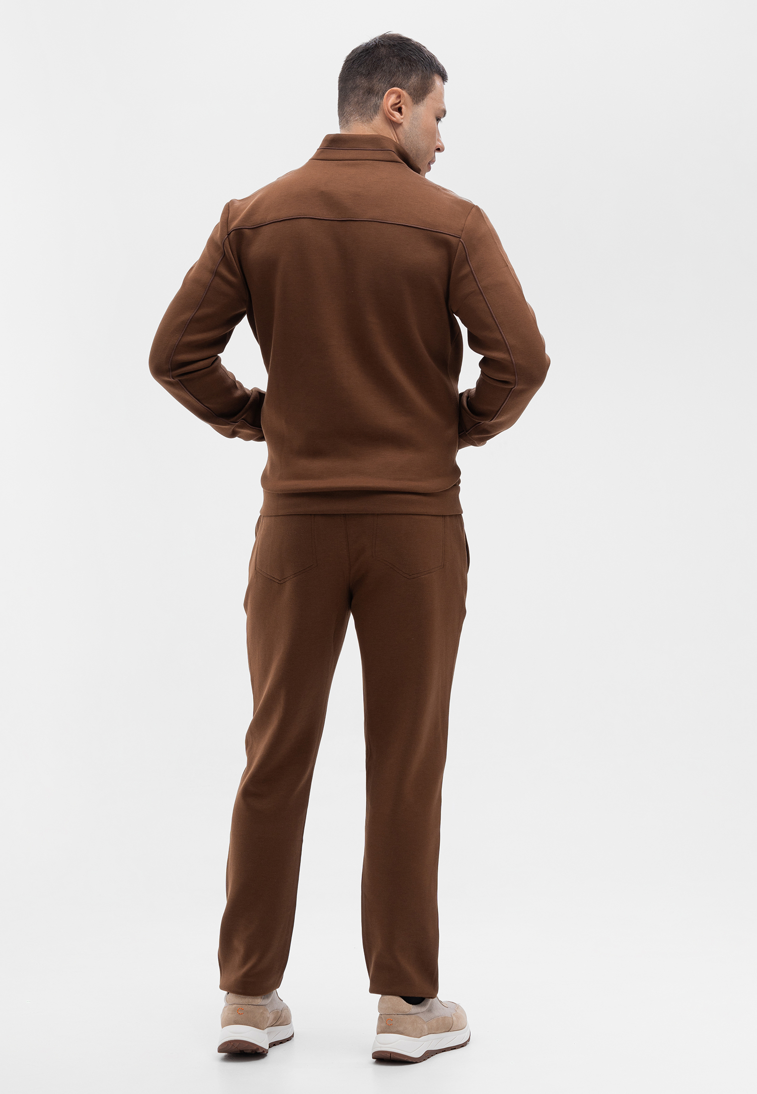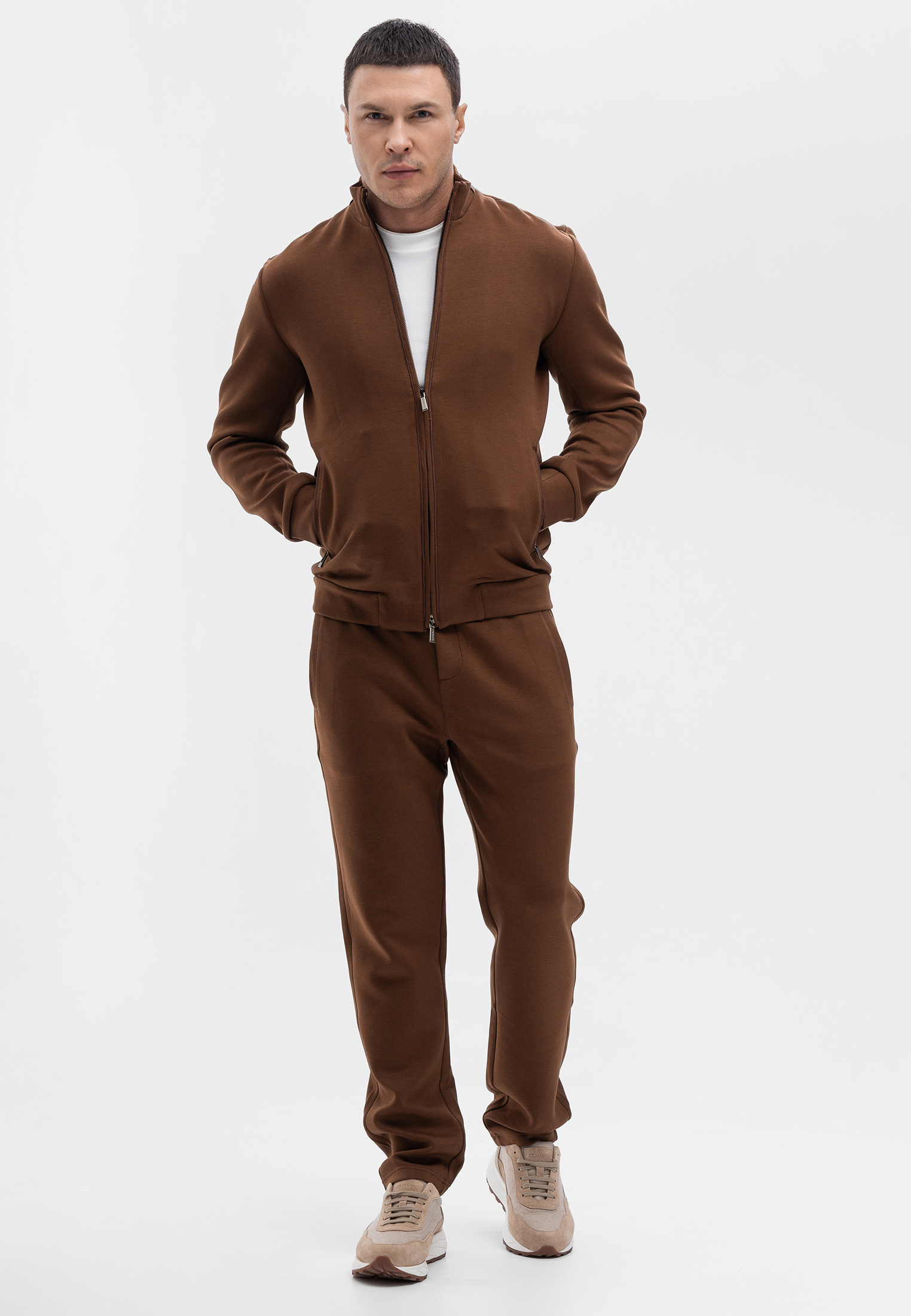 Прогулочный костюм коричневого цвета. Комплект выполнен из мягкого смесового материала с добавлением шерсти и лиоцелла, что обеспечивает комфорт и эластичность. Куртка на молнии с воротником-стойкой и двумя боковыми карманами дополнена брюками прямого кроя с удобным поясом. Ткань приятна на ощупь, дышащая и устойчива к деформации. Костюм идеально подходит для повседневных прогулок и путешествий, сочетая стиль и практичность.