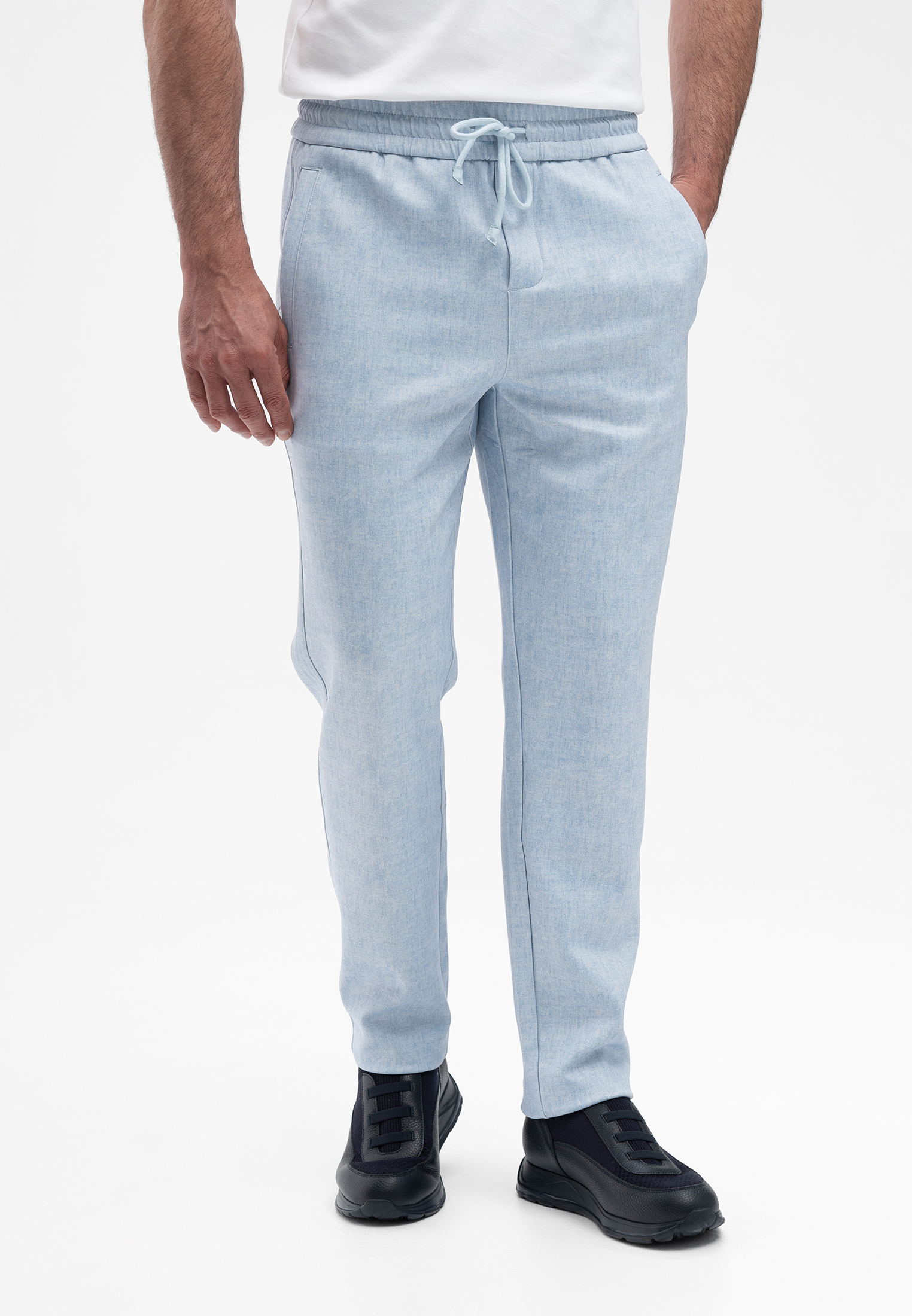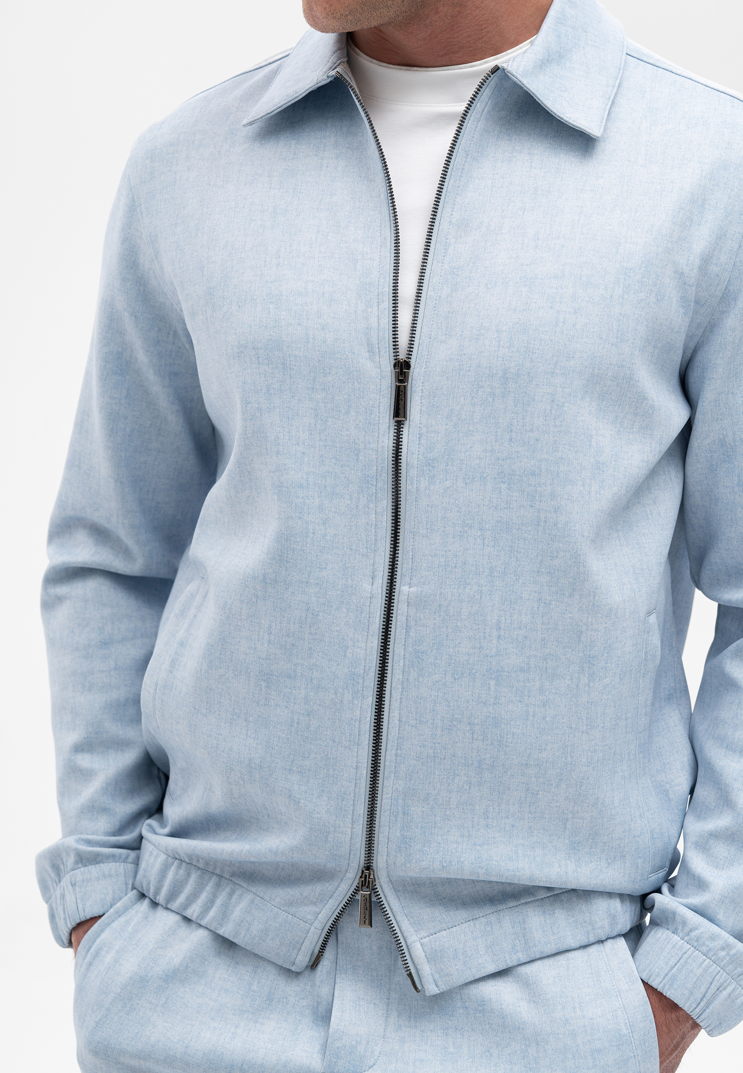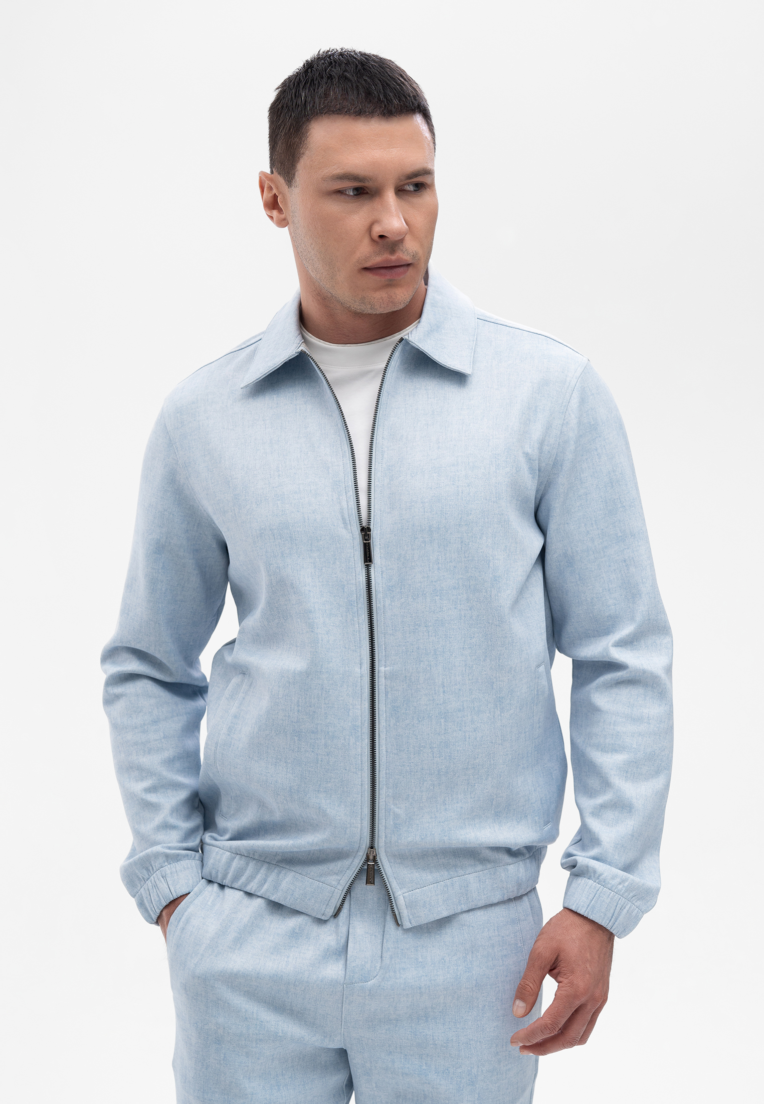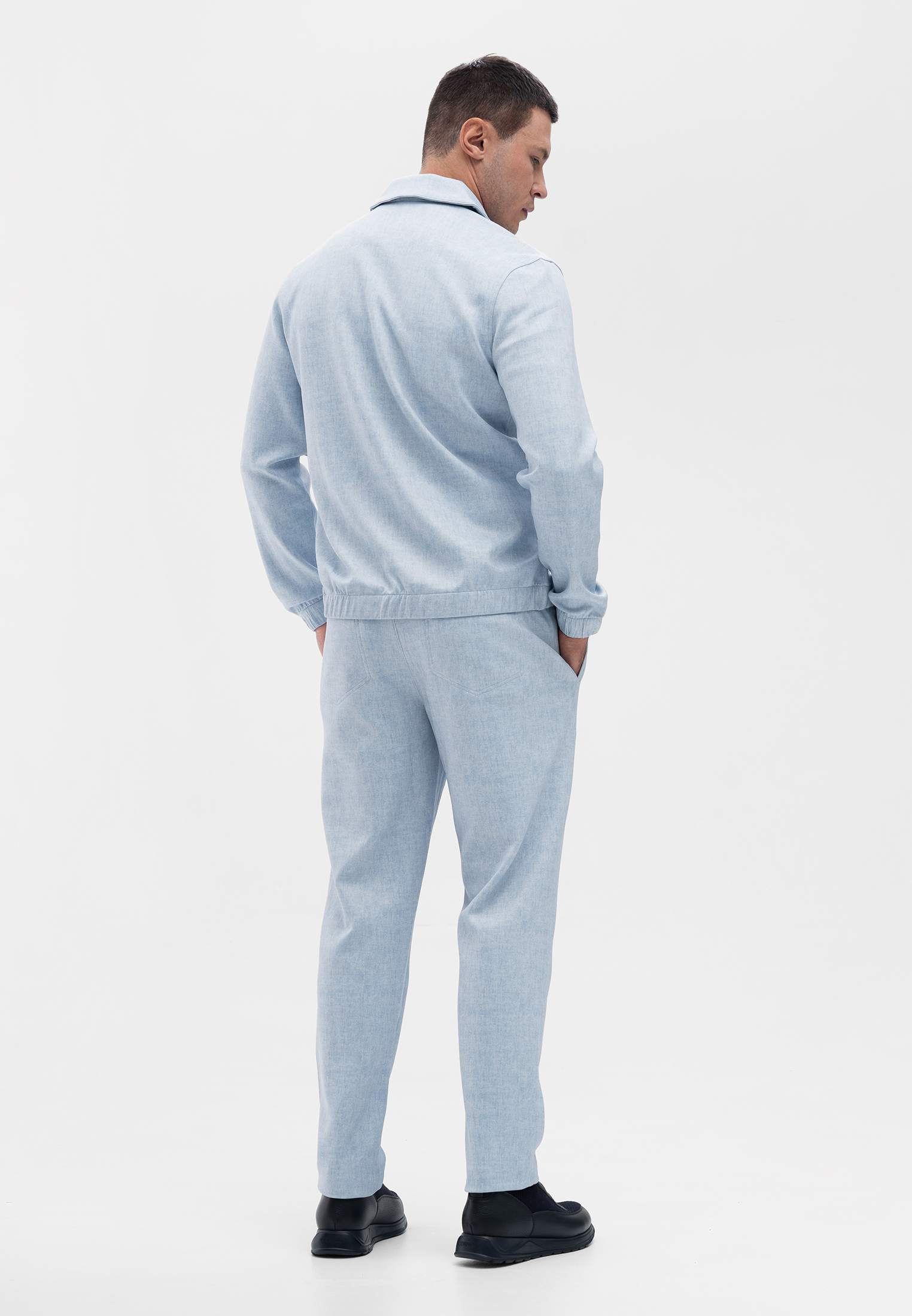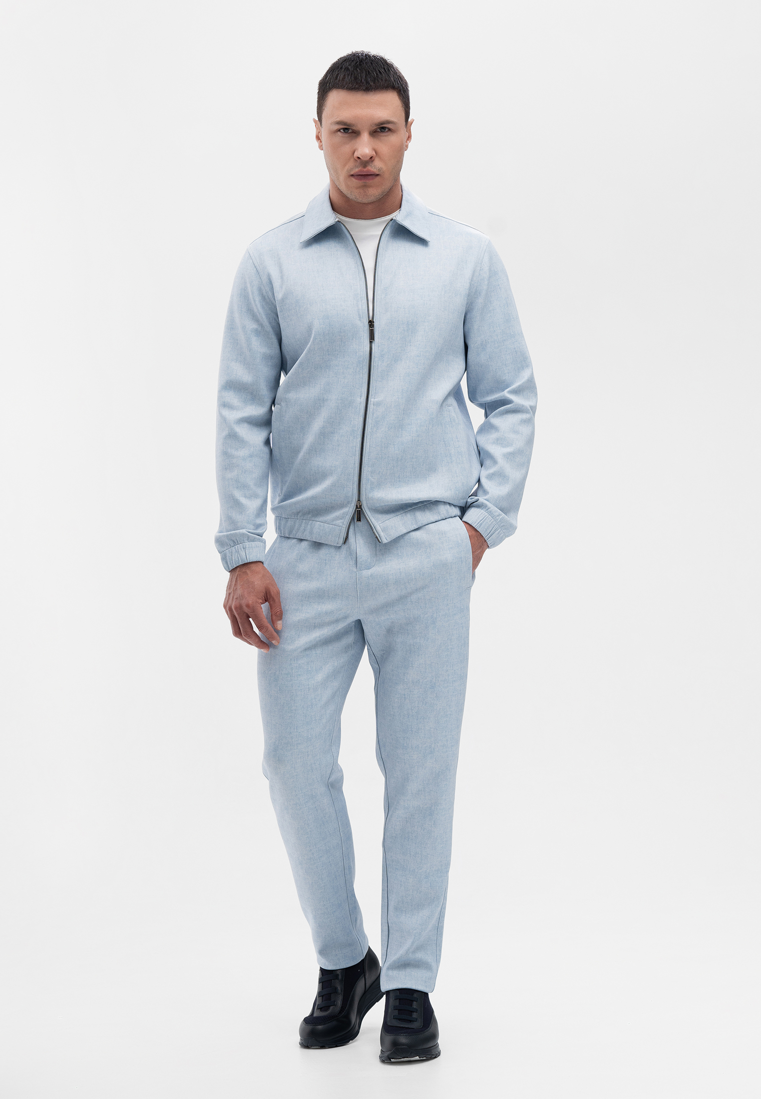 Прогулочный костюм голубого цвета. Комплект состоит из куртки на молнии и брюк прямого кроя. Куртка выполнена с отложным воротником и боковыми карманами, брюки — с удобной посадкой и гладким поясом. Материал с добавлением вискозы и эластана приятен на ощупь, хорошо держит форму и обеспечивает комфорт в движении. Элегантный и практичный вариант для современного городского стиля.