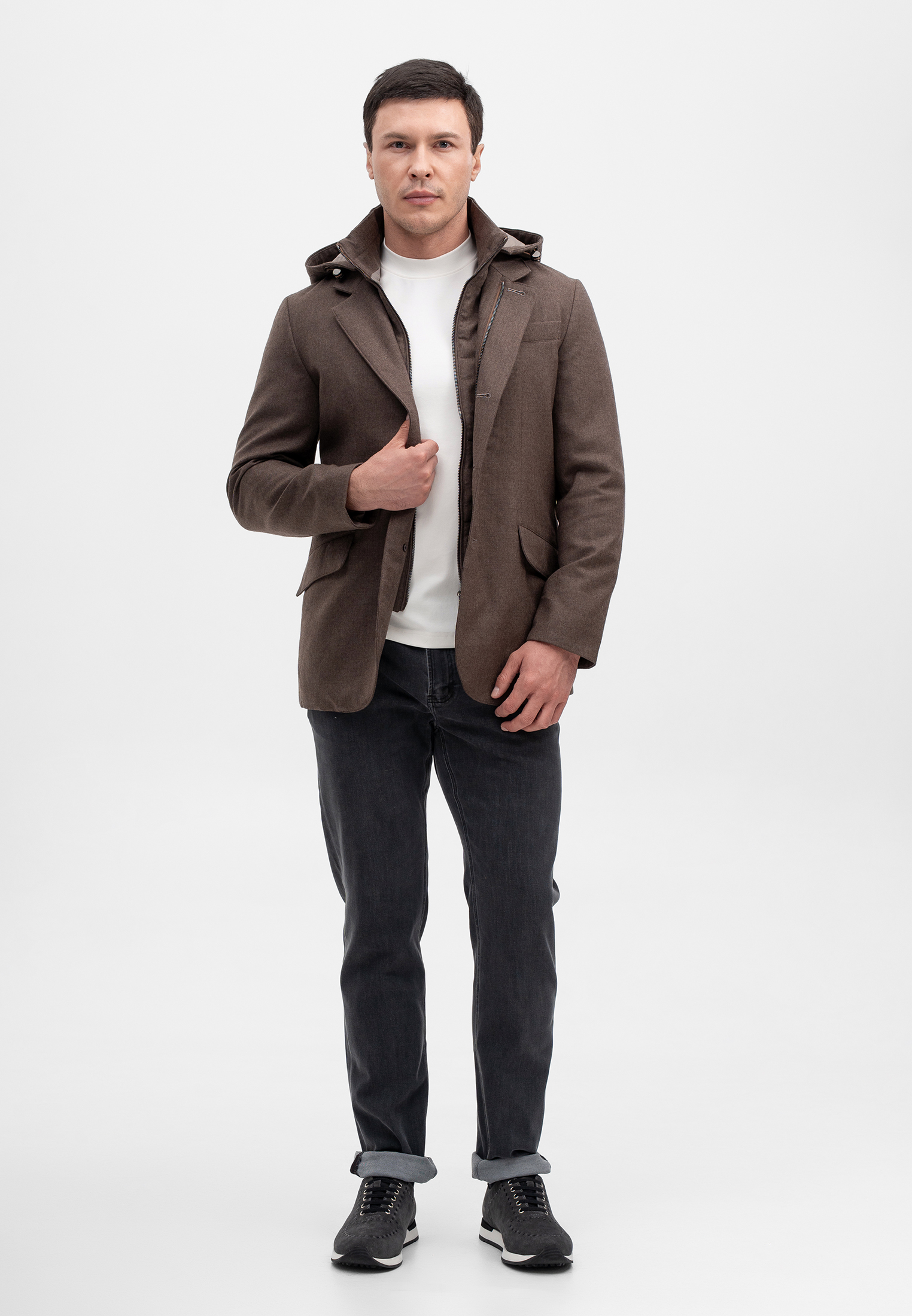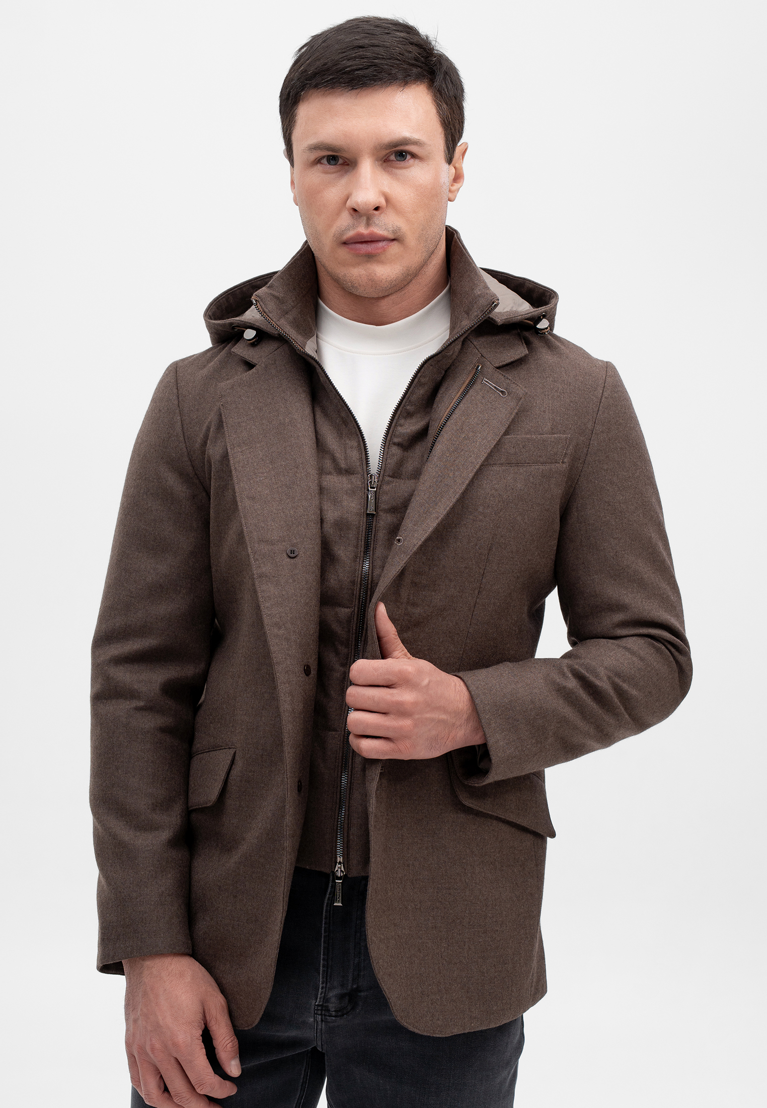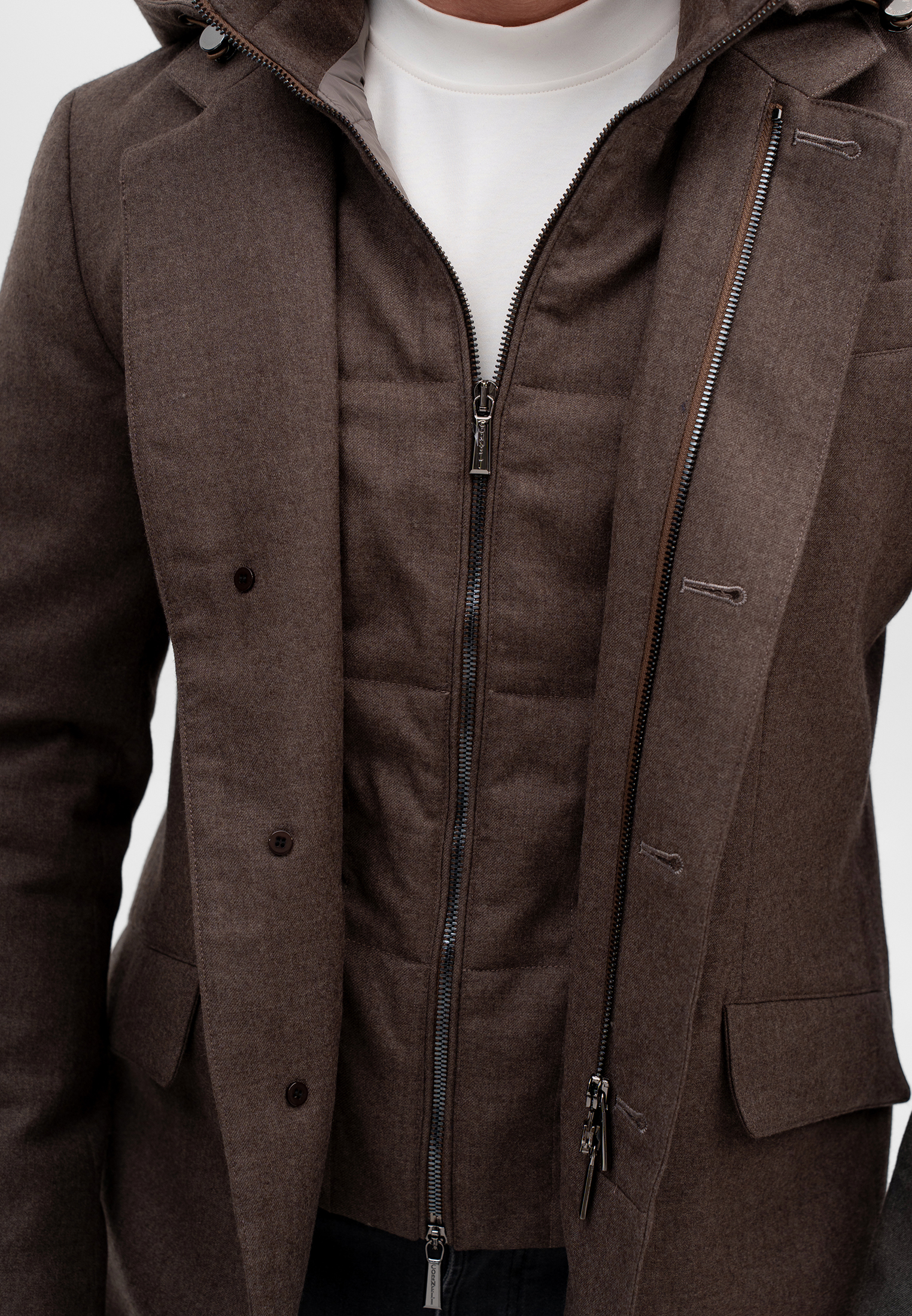 Шерстяная куртка коричневого цвета — элегантная и функциональная модель для холодного сезона, сочетающая классический стиль и современные технологии комфорта. Изделие выполнено из премиальной смеси шерсти (90%) и кашемира (10%), что обеспечивает мягкость, тепло и благородную фактуру ткани. Утеплитель из утиного пуха и пера сохраняет тепло, не утяжеляя силуэт. Многослойная конструкция с внутренней стёганой частью и капюшоном добавляет практичности и делает куртку универсальной для городской жизни. Сдержанный коричневый оттенок подчёркивает статус и премиальный характер бренда CORNELI, легко вписываясь в повседневные и smart-casual образы.