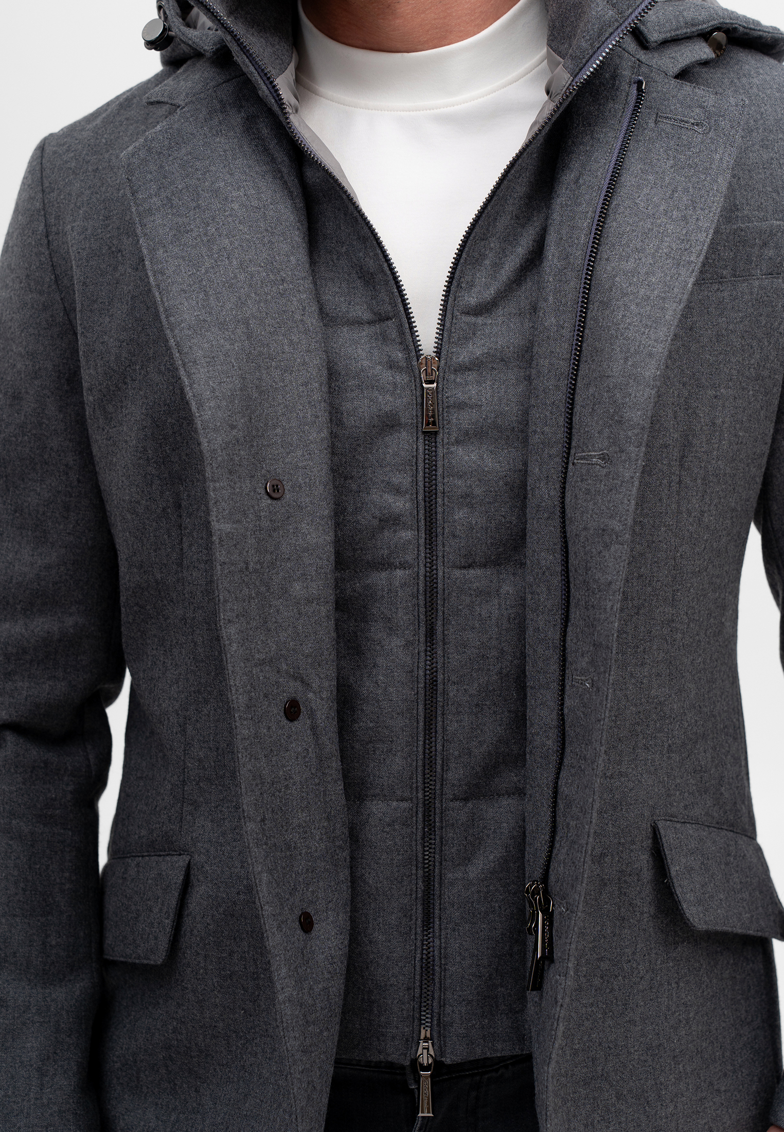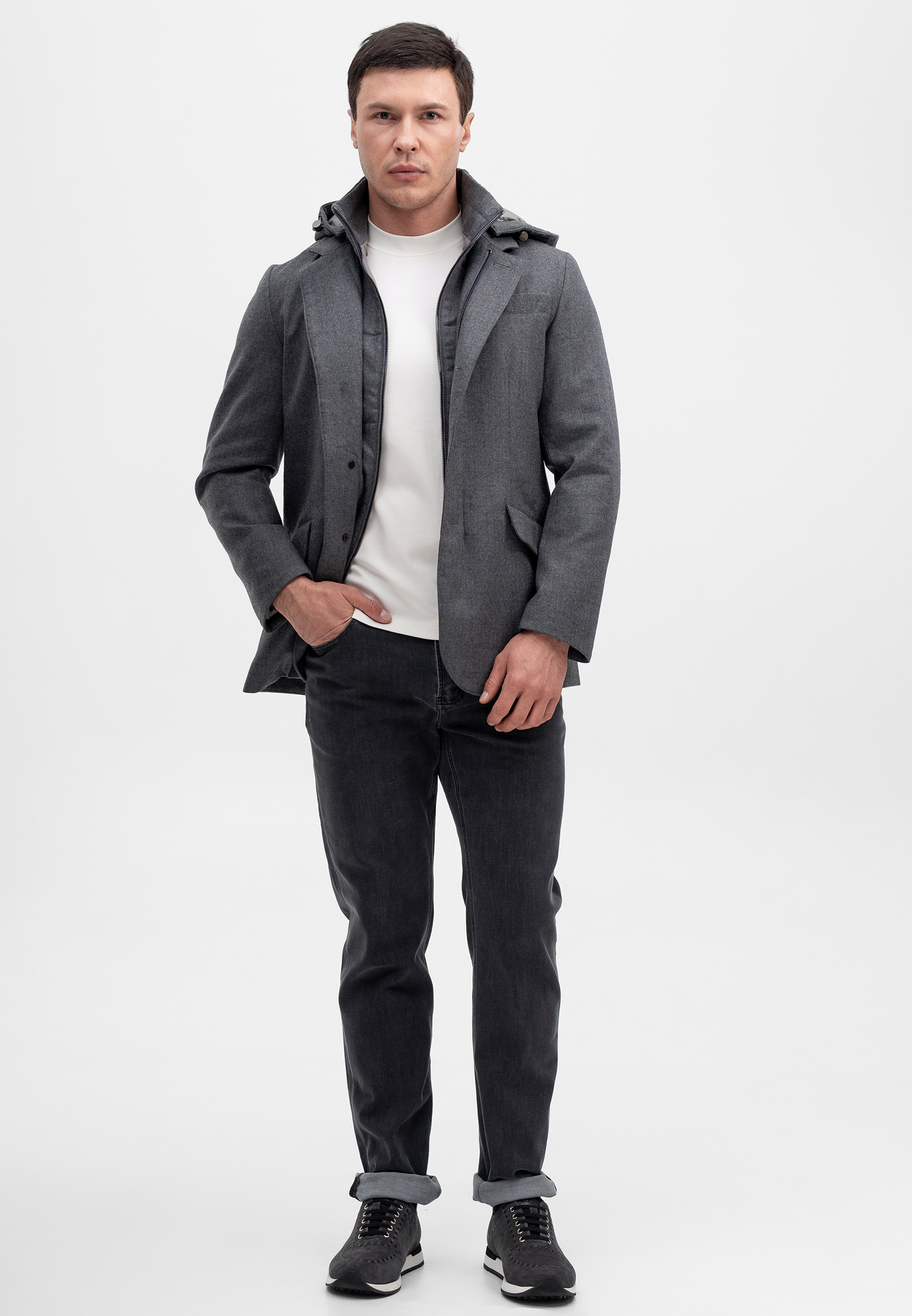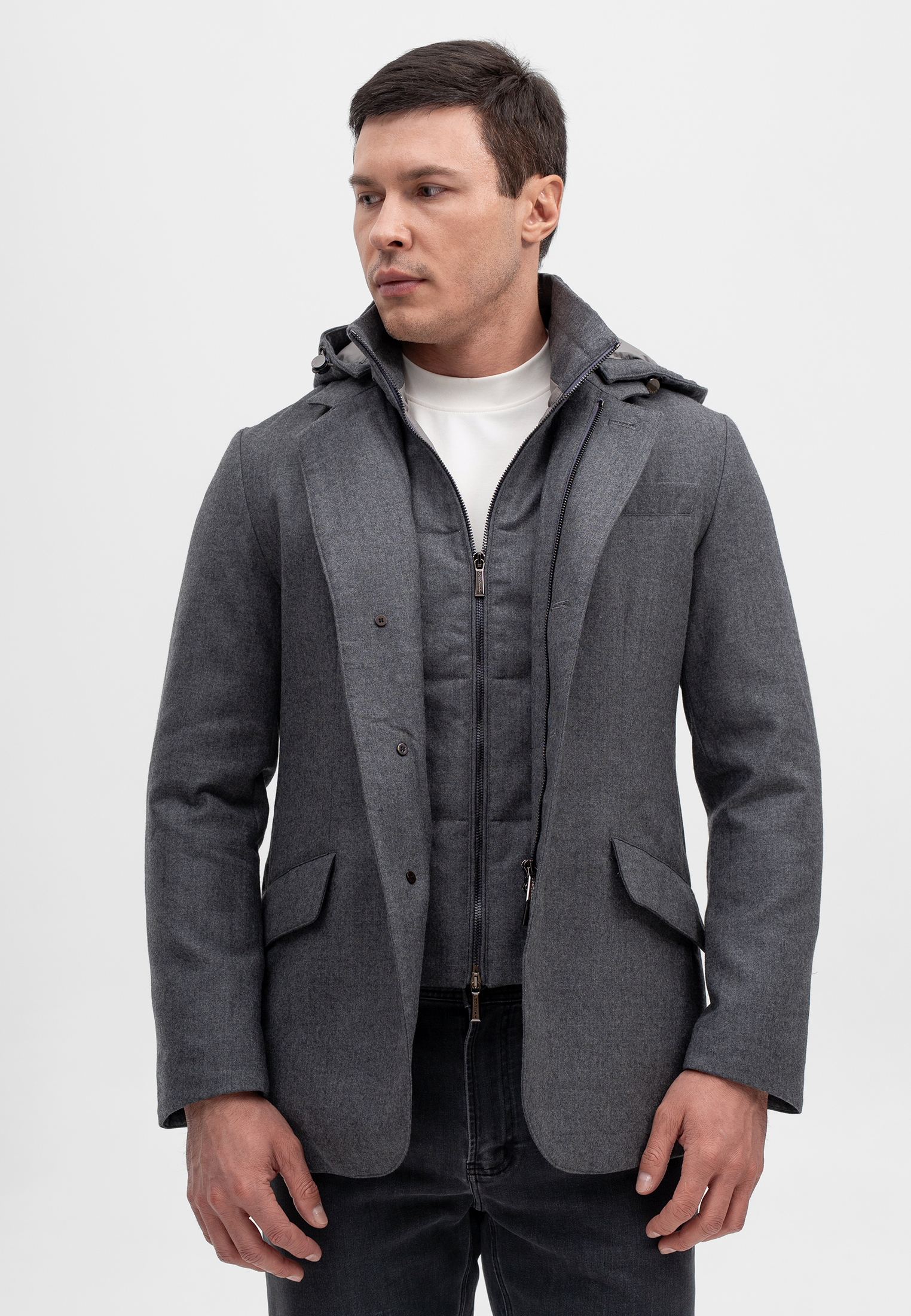 Шерстяная куртка серого цвета — универсальная модель премиального уровня, сочетающая строгую эстетику и высокий уровень комфорта. Выполнена из благородной смеси шерсти (90%) и кашемира (10%), что обеспечивает мягкость, тепло и износостойкость изделия. Утеплитель из утиного пуха и пера эффективно сохраняет тепло, оставаясь лёгким и комфортным при носке. Многослойная конструкция с внутренней стёганой вставкой и капюшоном добавляет практичности и делает куртку подходящей как для деловых, так и для повседневных образов. Лаконичный серый оттенок подчёркивает сдержанную элегантность и премиальный характер бренда CORNELI.