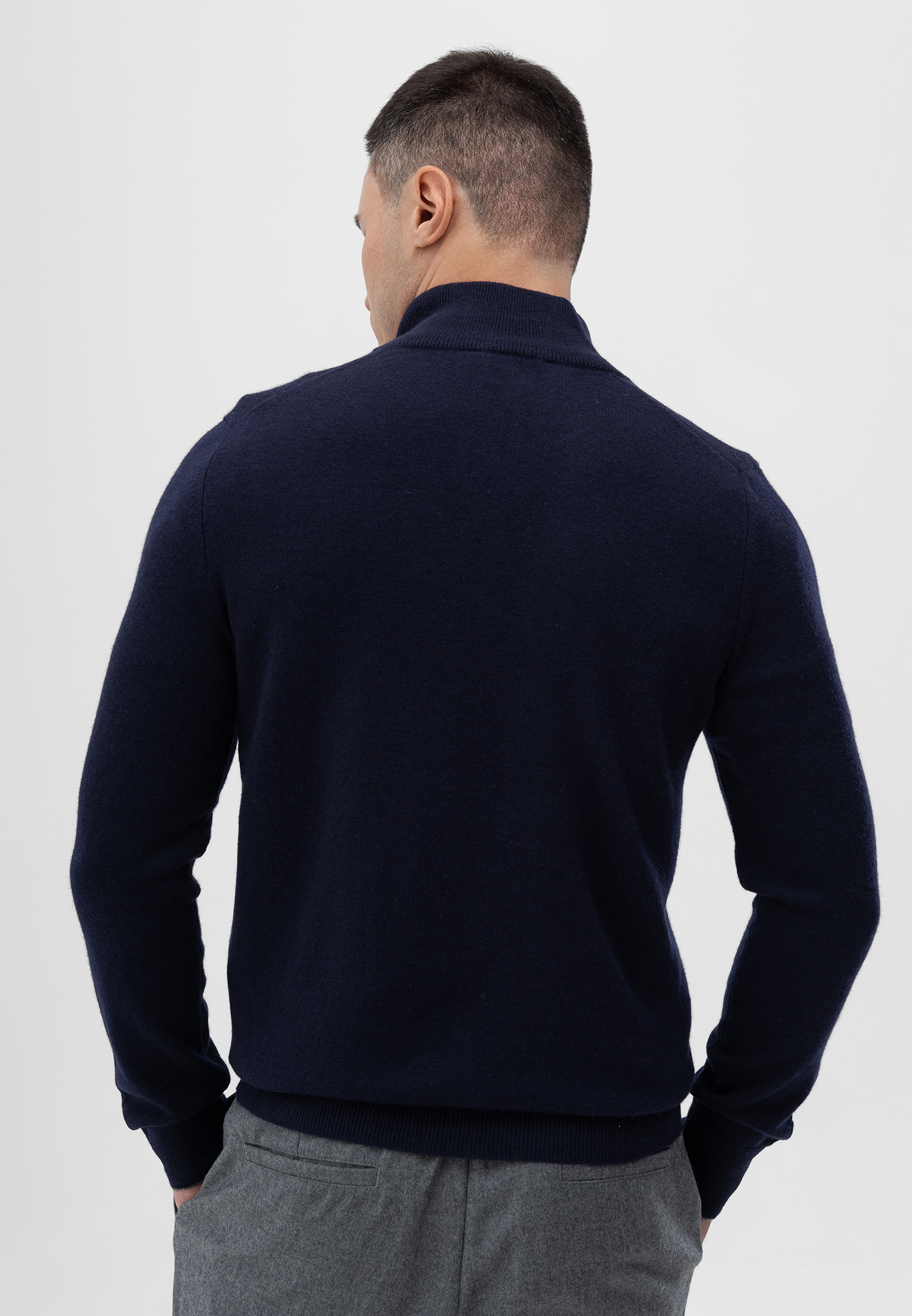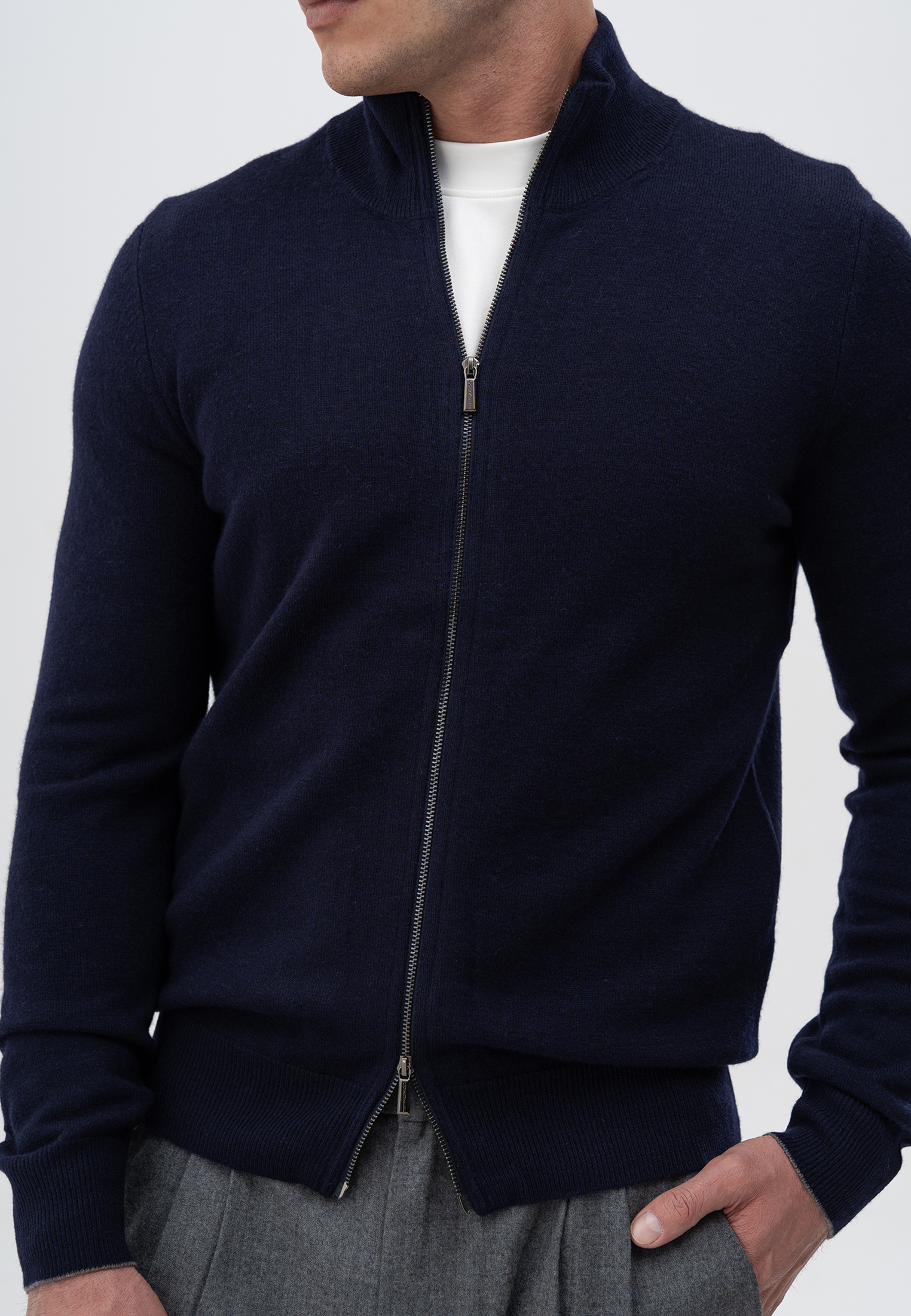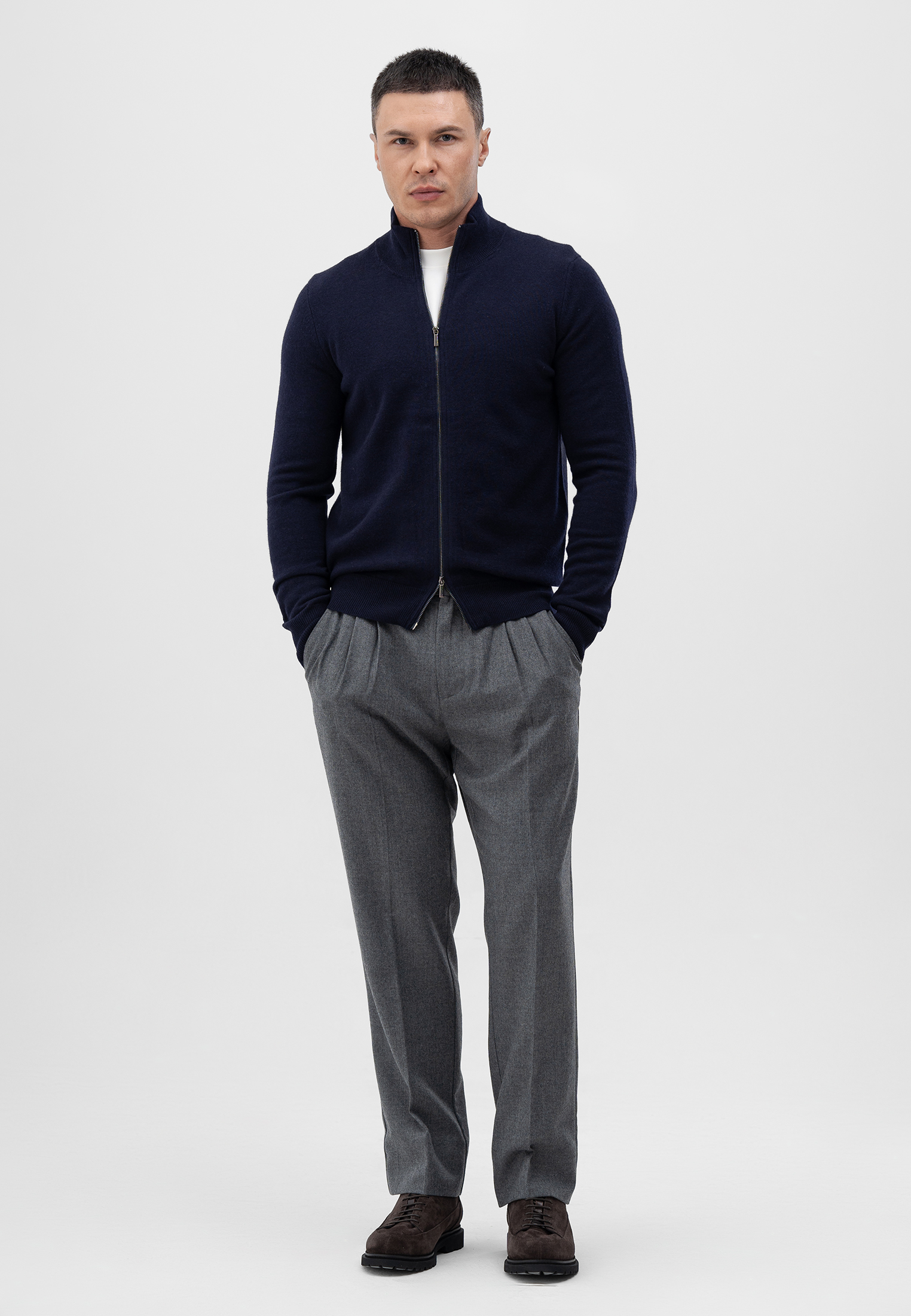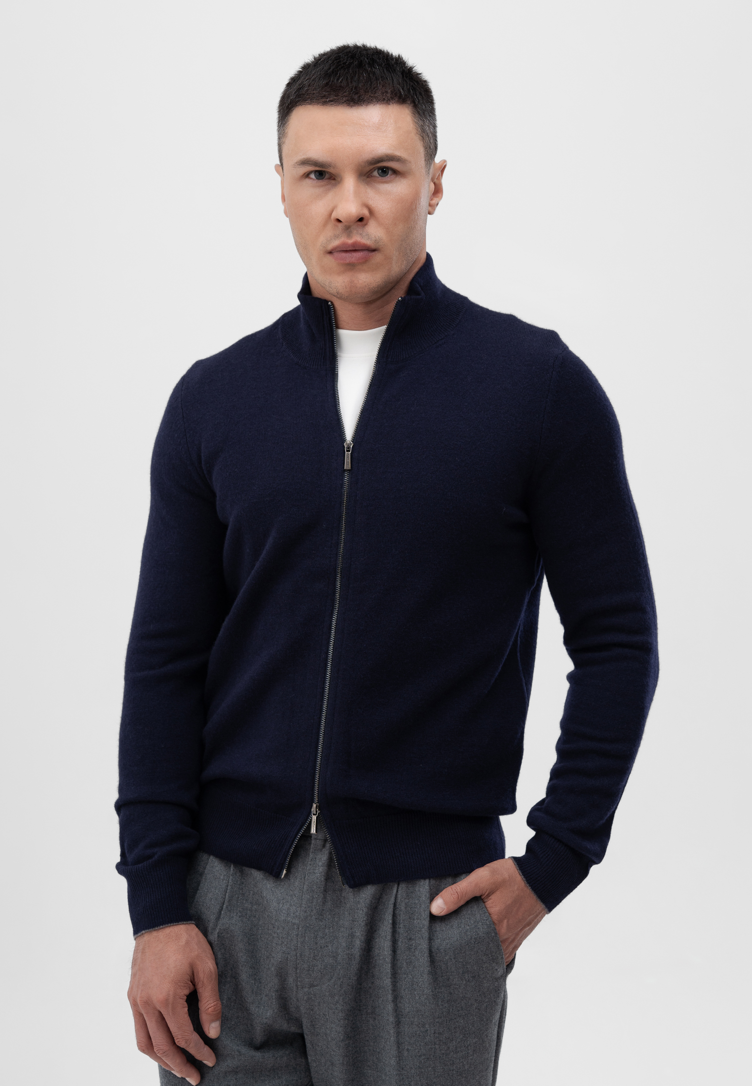 Кардиган темно-синего цвета. Выполнен из мягкой 100% шерсти. Модель прямого кроя с воротником-стойкой и застежкой на двустороннюю молнию. Манжеты и низ изделия оформлены эластичной резинкой для удобной посадки. Натуральная шерсть обладает мягкой фактурой и хорошо сохраняет тепло, что делает кардиган универсальным элементом гардероба для прохладного сезона.
