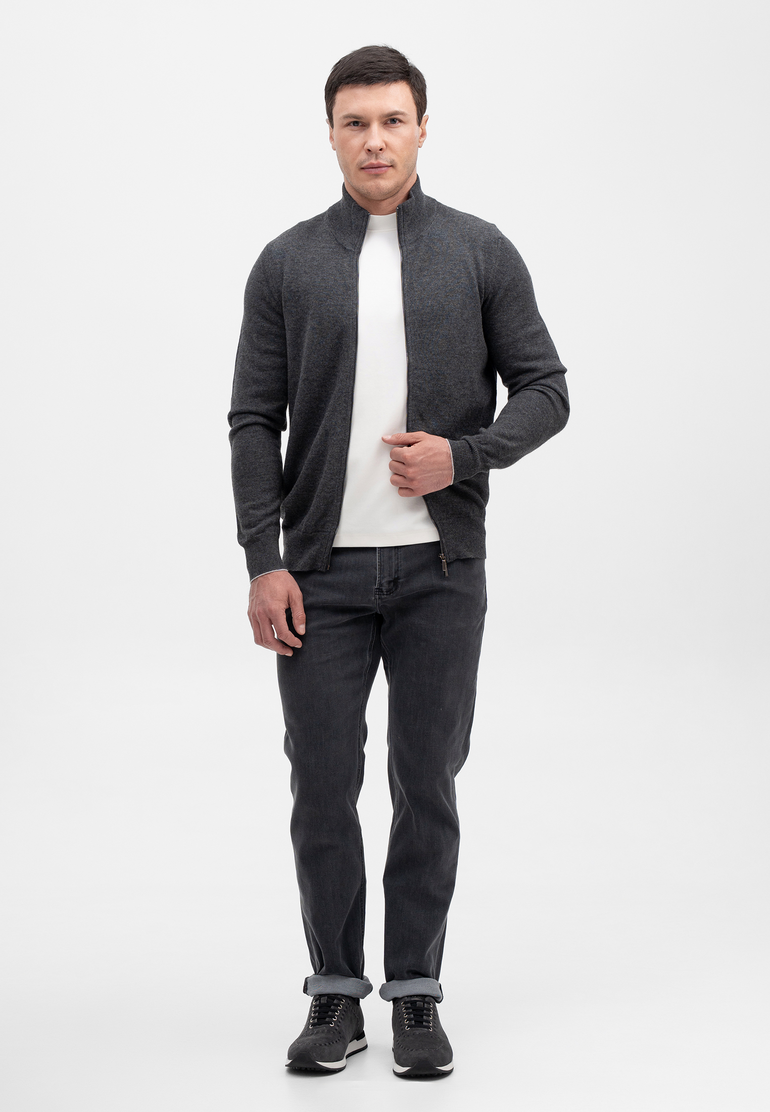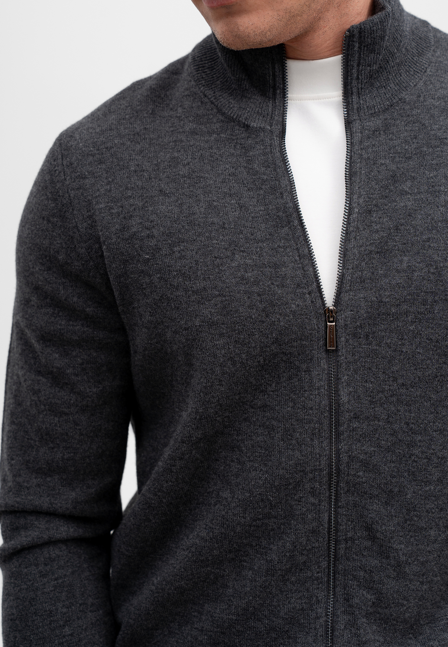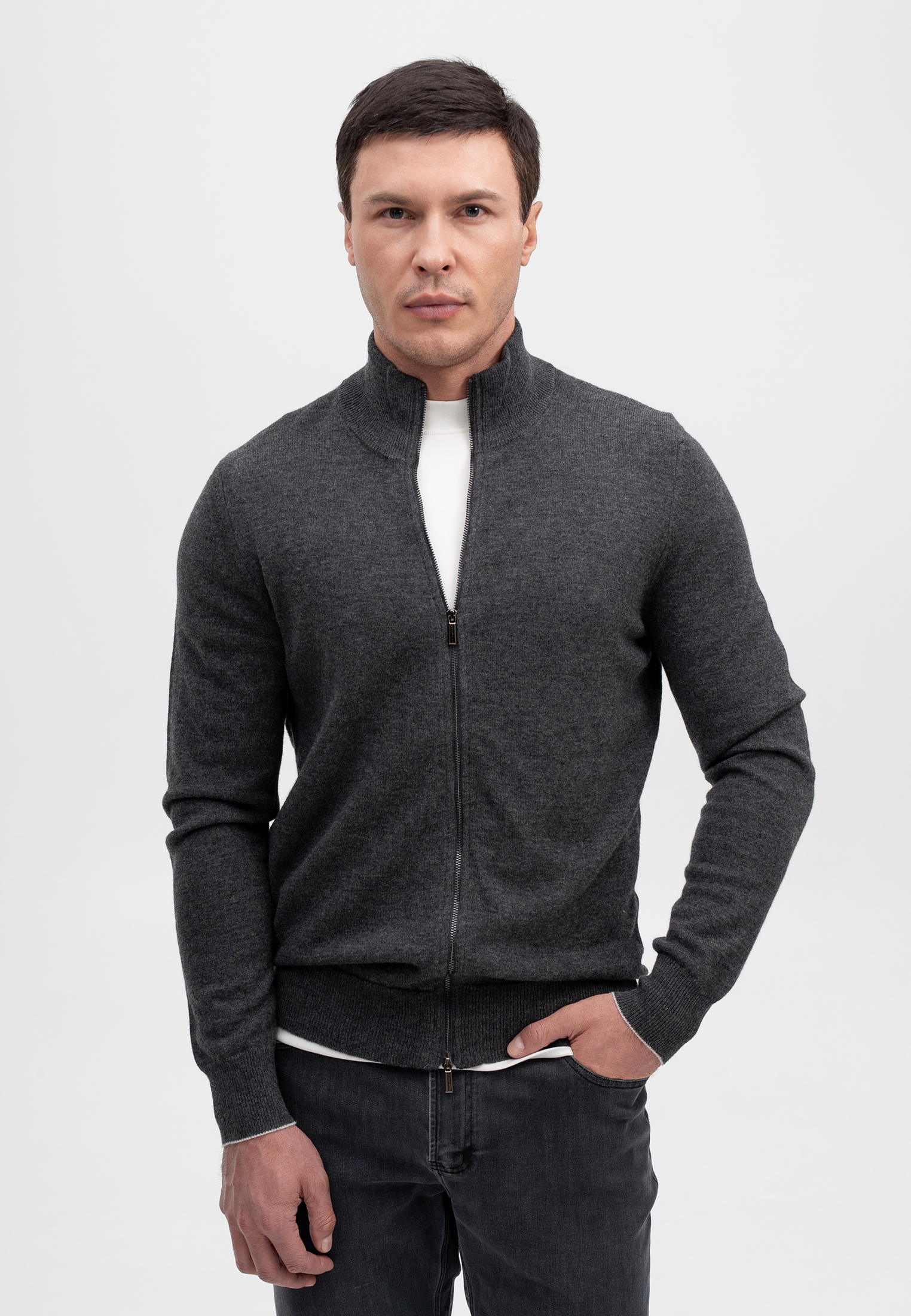 Шерстяной кардиган тёмно-серого цвета — универсальная модель для повседневного и smart-casual гардероба. Изделие выполнено из 100% натуральной шерсти, которая отлично сохраняет тепло, остаётся дышащей и комфортной в носке. Лаконичный дизайн с застёжкой на молнию и воротником-стойкой подчёркивает сдержанную элегантность модели и аккуратный силуэт. Кардиган легко сочетается как с футболками, так и с рубашками, отражая премиальный стиль бренда CORNELI.