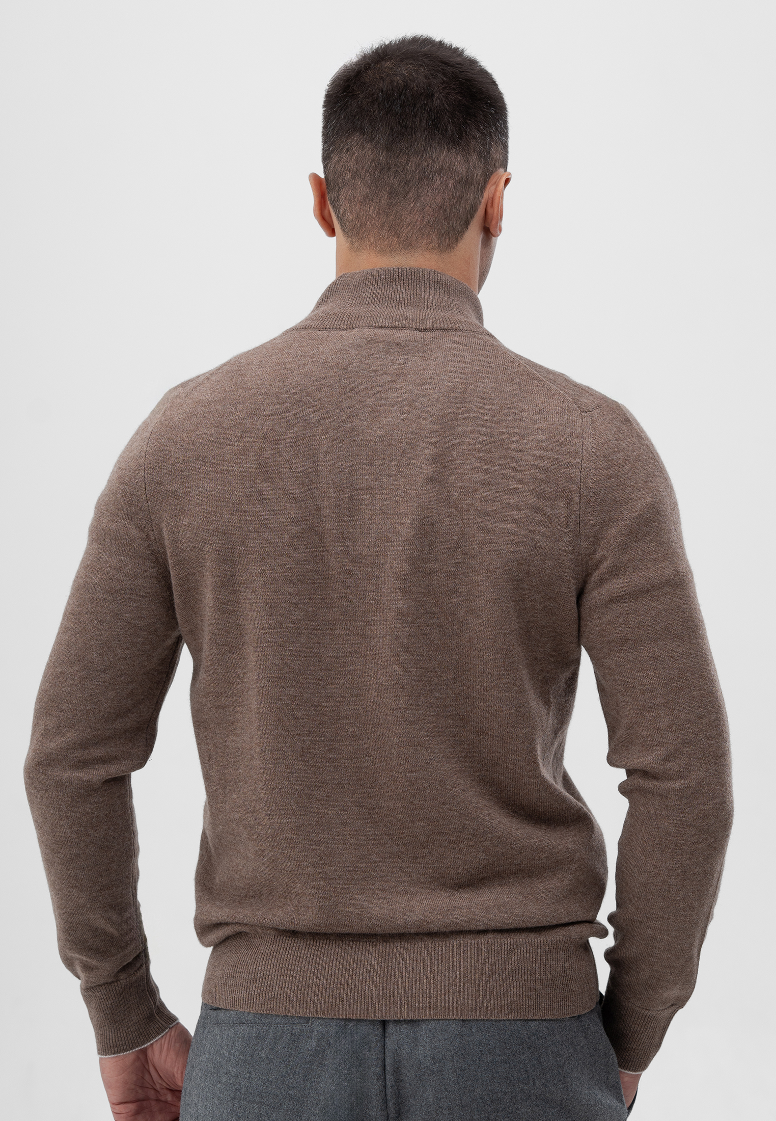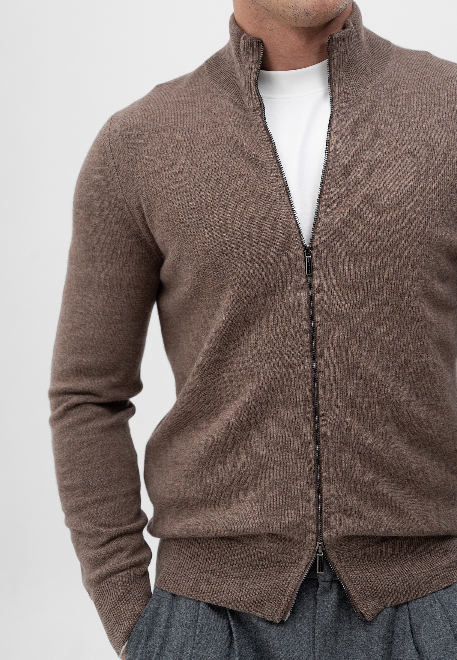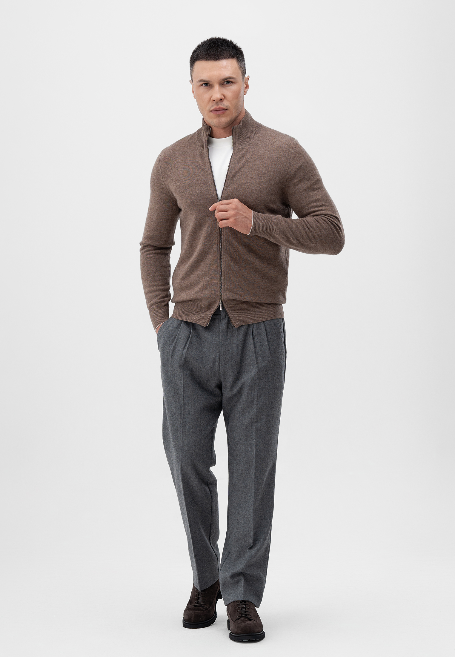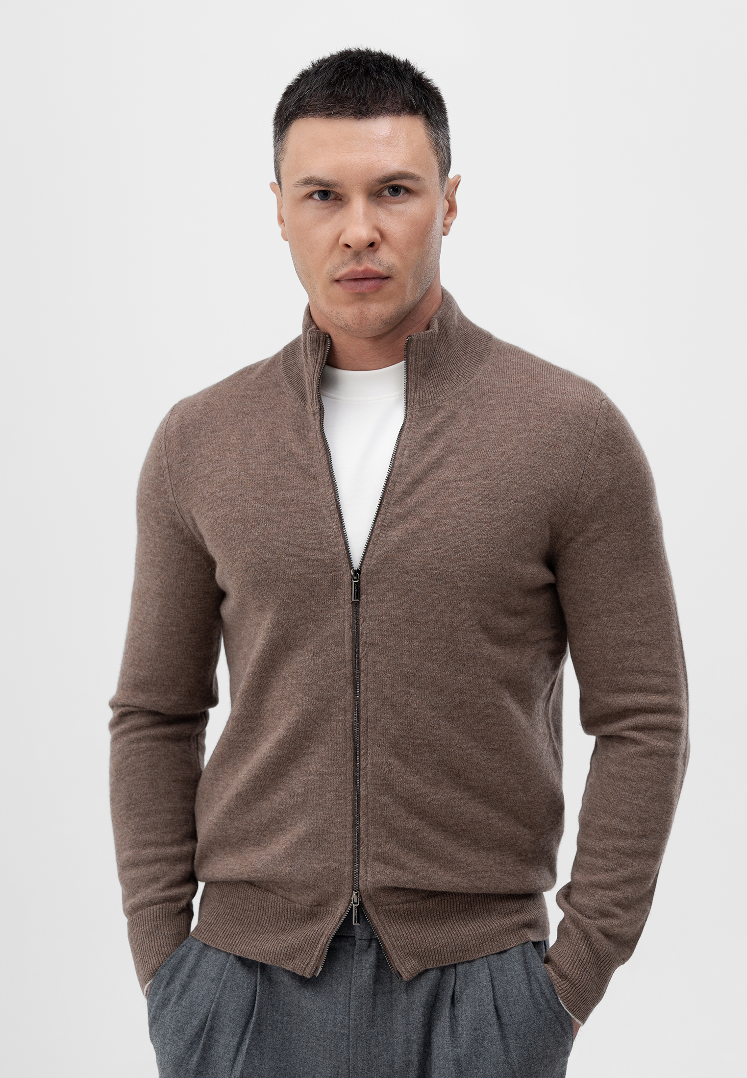 Кардиган светло-коричневого цвета. Выполнен из мягкой 100% шерсти. Модель прямого кроя с воротником-стойкой и застежкой на двустороннюю молнию. Манжеты и низ изделия оформлены эластичной резинкой для комфортной посадки. Натуральная шерсть обладает приятной текстурой и хорошо сохраняет тепло, что делает кардиган идеальным выбором для прохладного сезона.