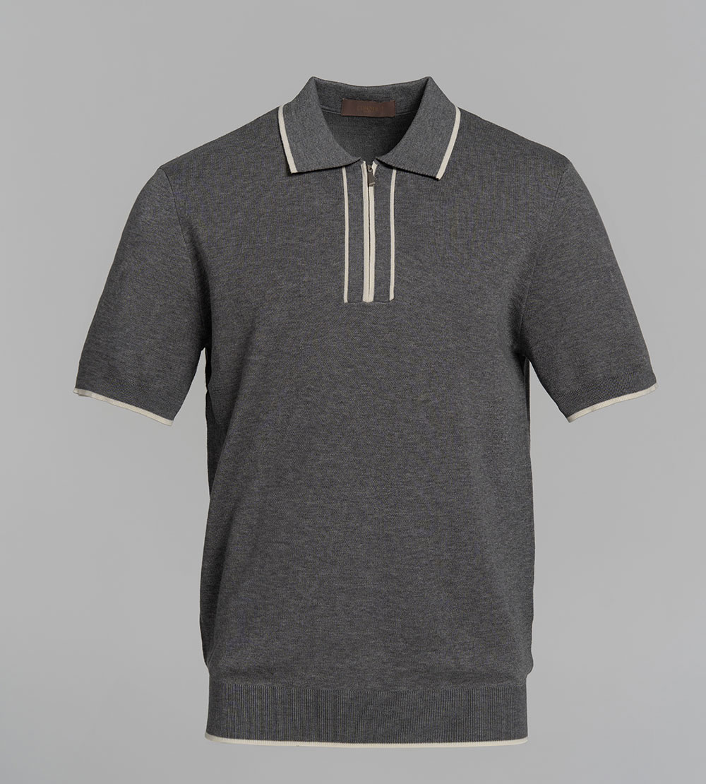 Поло прямого кроя. Отложной воротник и края рукавов с контрастной отделкой. Короткие рукава. Застежка на пуговицы на планке.