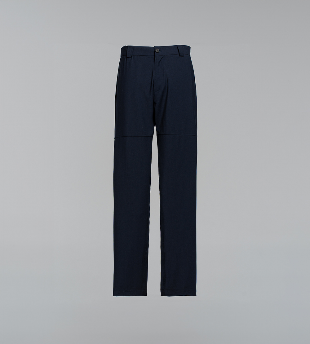 Брюки прямого кроя. Из шерсти с добавлением эластана и шелка. Пояс со шлевками для ремня. Боковые прорезные карманы. Сзади прорезные карманы на пуговицах. Декорированы горизонтальными швами. Застежка на пуговицу и молнию.