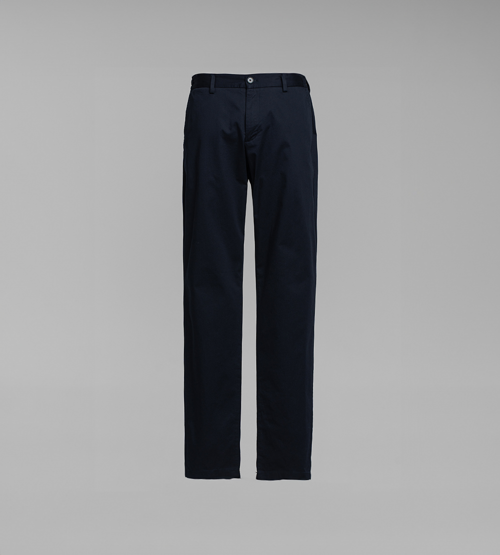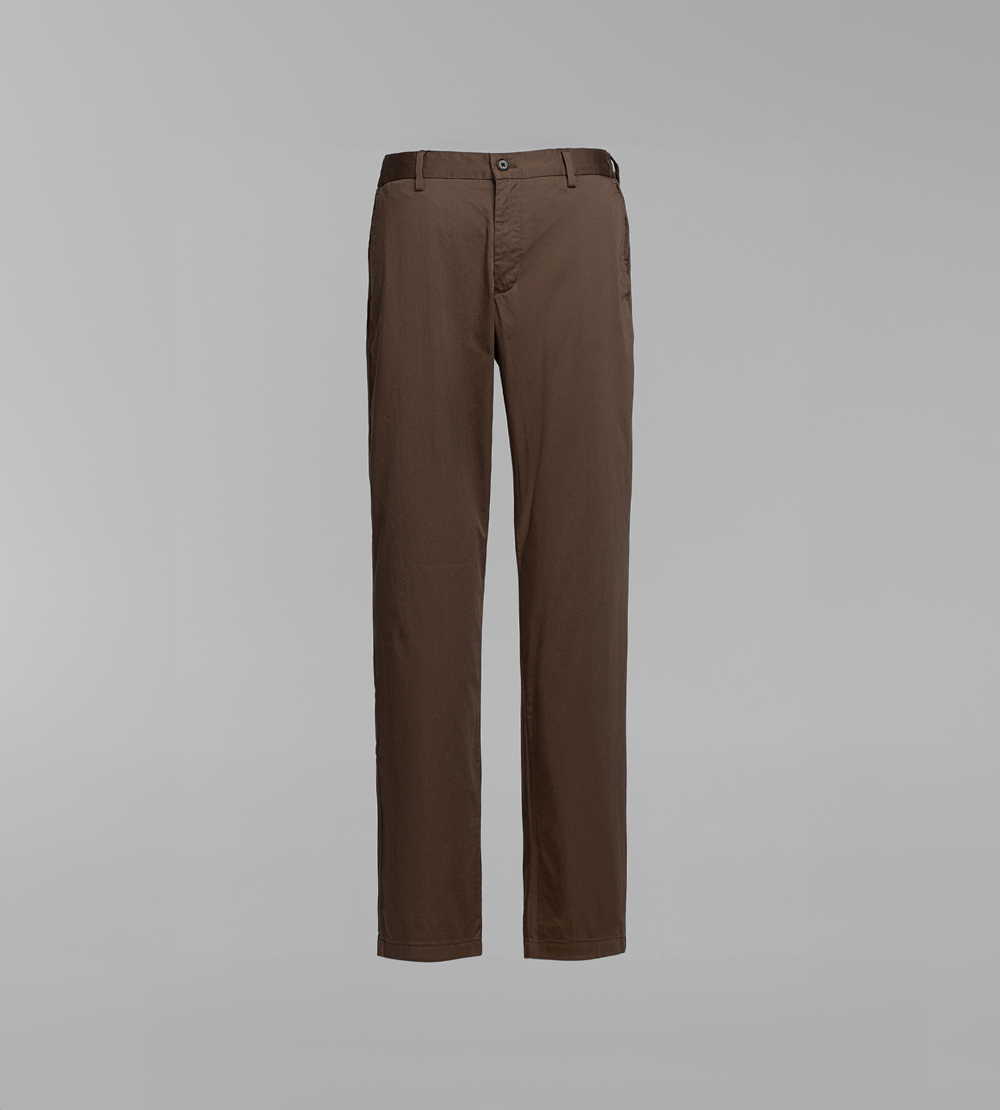 Брюки прямого кроя. Пояс со шлевками для ремня. Боковые прорезные карманы. Накладные карманы сзади. Застежка на пуговицу и молнию