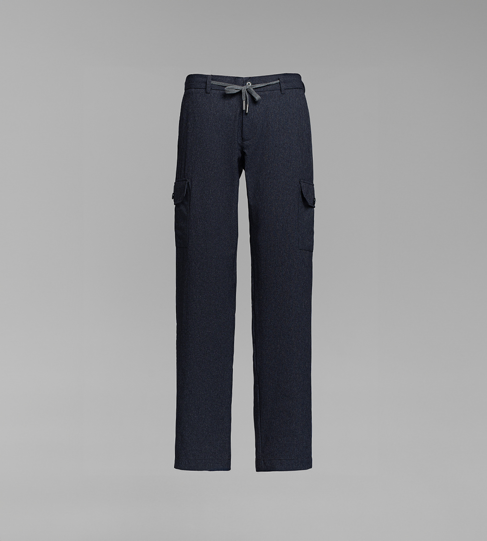 Брюки прямого кроя. Пояс со шлевками для ремня. Боковые прорезные карманы. Накладные карманы с клапанами на бёдрах. Сзади прорезные карманы на пуговицах. Застежка на пуговицу и молнию